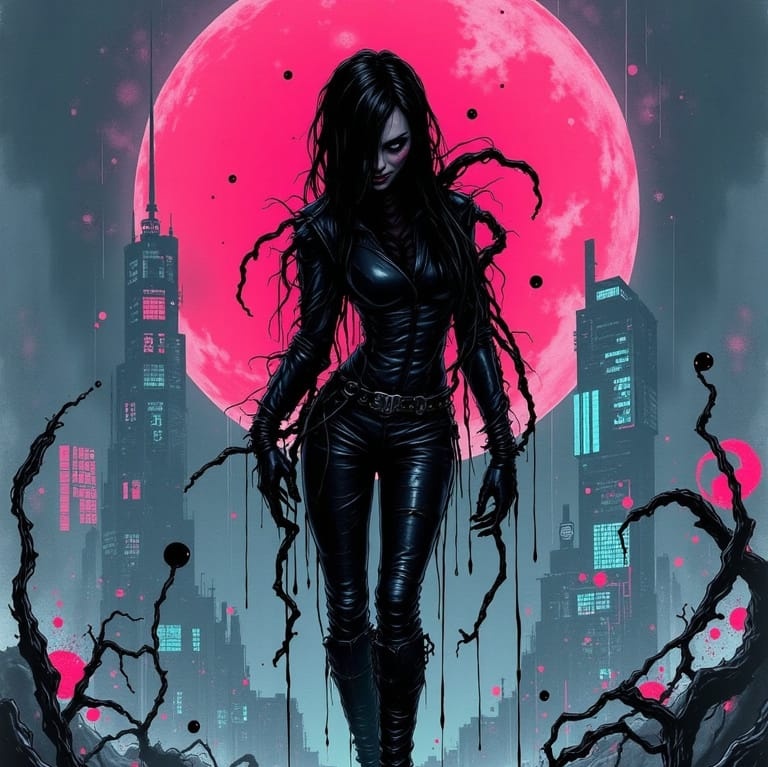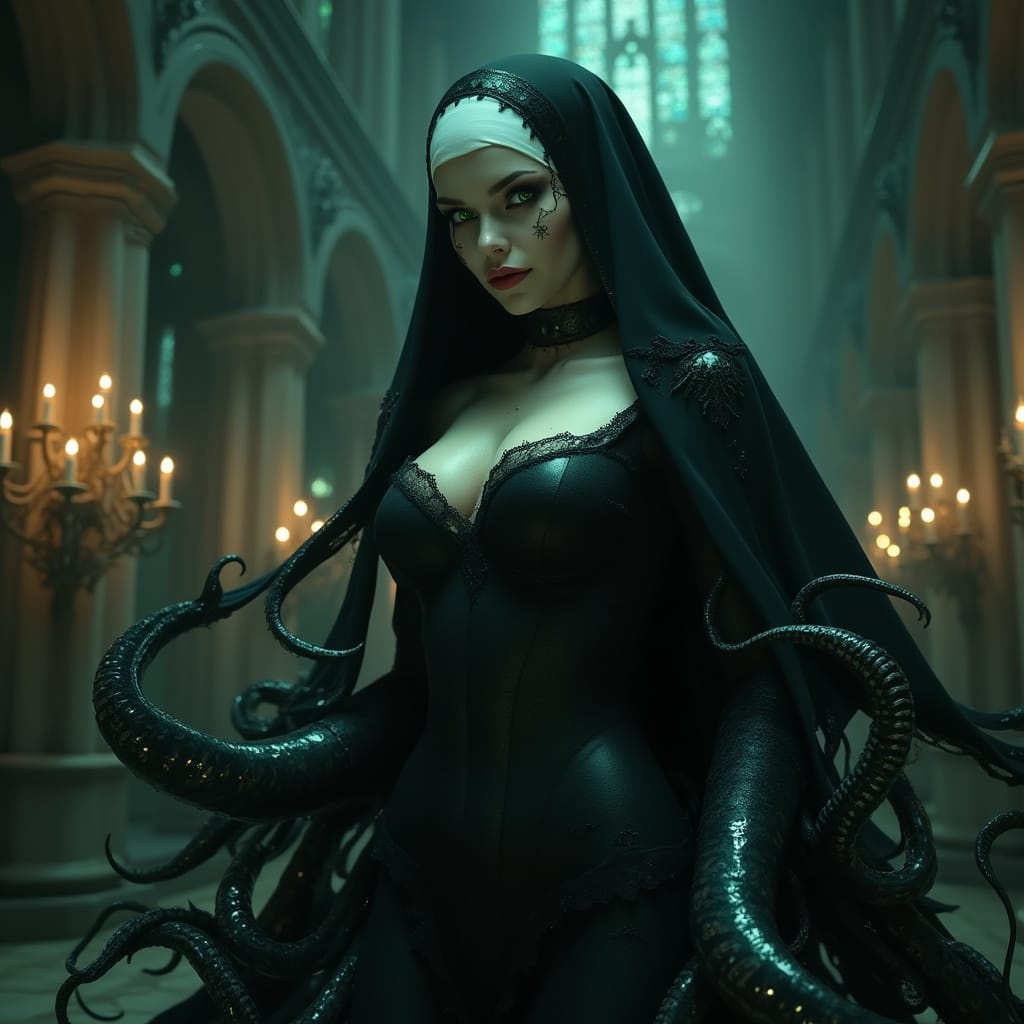 A filthy, gothcore EDM track with brooding synth layers, distorted bass, and aggressive industrial percussion, Rhythms pulse with ominous depth, blending eerie ambient textures and metallic hits, Drops feature glitched effects, while a seductive robotic female voice weaves through, cold yet alluring
