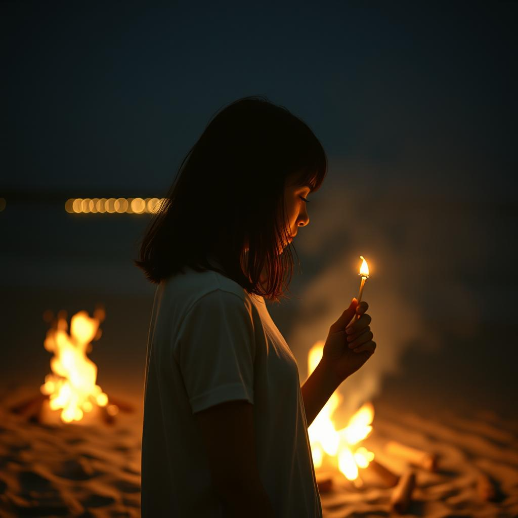 Tells a girl's sigh in front of a sunset bonfire on the beach