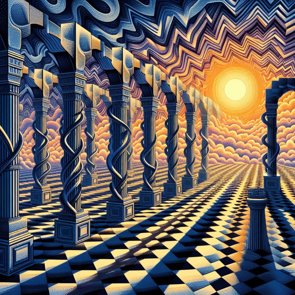 Progressive arch electronic in 102 BPM—prime 8 layers unfolding like waves, [Voice] hazy, doubled in dream delay; [Bass] warm, liquid, bending gravity beneath; [Lead] guitar-synth hybrid, sun-warped phaser glide; [Chorus] airy falsetto, harmonized like cicadas in dusk, Pads bloom as [layer 5], analog haze; [layer 6] percussive ticks, sand-grain snares; [layer 7] low organ hum grounding; [layer 8] reverb clouds dissolving, Each tone arcs like a sine wave, silence shaping the rhythm, chords resolving as if light suture binds fading day to infinite night