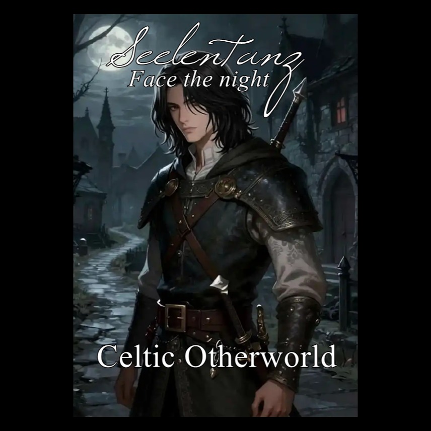 Create an Celtic-inspired dark fantasy song, Moody, mystical, with a medieval Irish feel, playful sound, Old Irish language an English language, Minimal instruments, Only Harp, Tin wisthle, Hand Drums, misterious choir in background, Story telling, echos