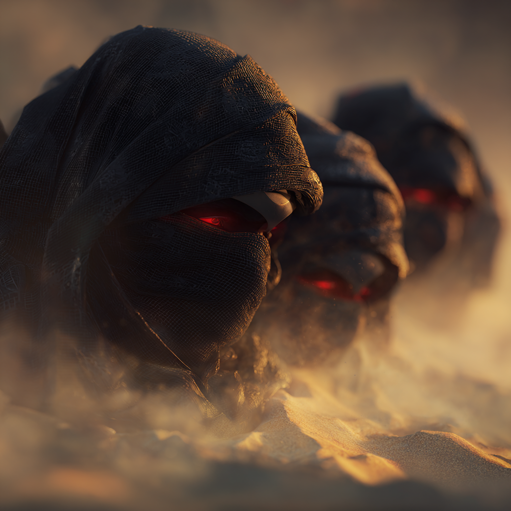 Opens with deep Sanskrit throat chants and distant sand wind FX, joined by haunting female whispers and dark tribal percussion (dhol, darbuka), Massive Moog bass and industrial Phonk elements layer over menacing war drums, with cinematic synth waves swelling, Battle cries, battlefield yells, and Sanskrit phrases surge into brutal dubstep drops, Death metal and deathcore guitars interlock with double-kick drums, shifting between dense, relentless walls and sudden, agile breakdowns, Chorus climaxes with fused genres—glitched tribal chants, ferocious riffs, syncopated rhythms, and war anthem grandeur