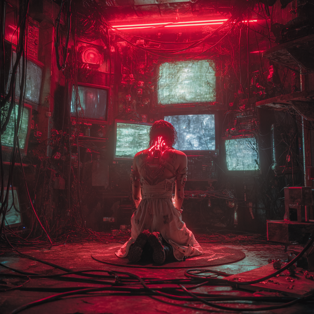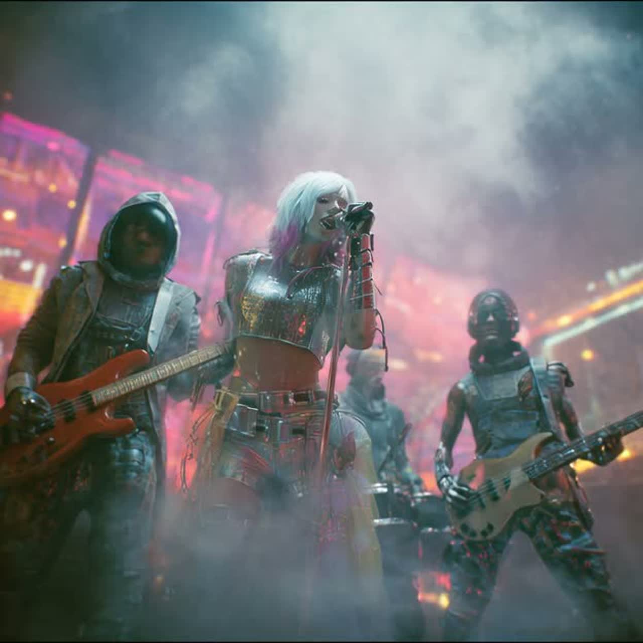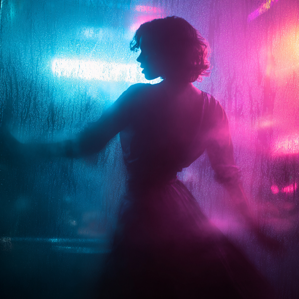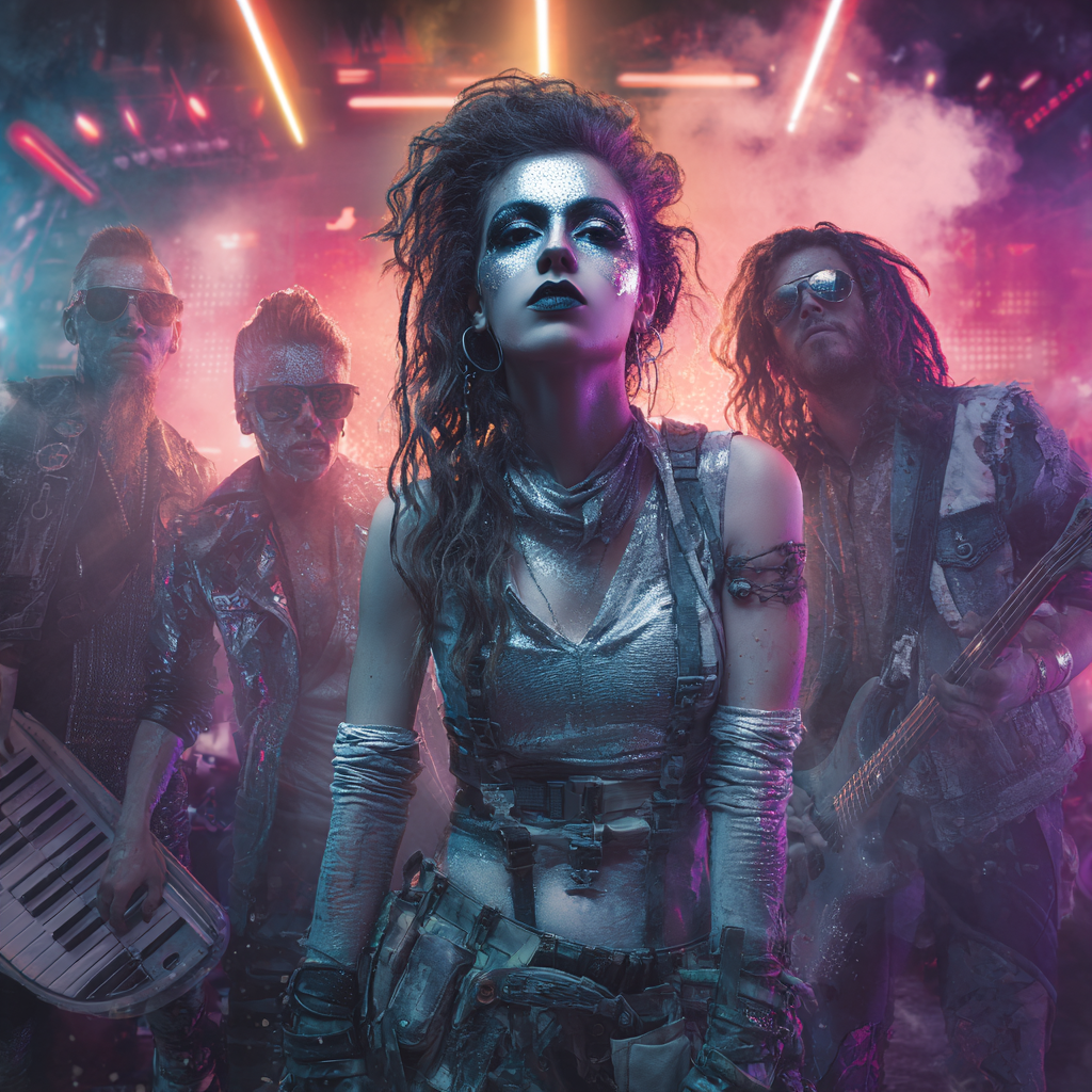 Cyberpunk Progressive Rock, Neon Resonance, Digital Warmth, Holographic Texture, Night City 2077, rooftop live take — open skylines, neon haze, holographic billboards flickering through the smog, One-take acid-prog jam in E minor, flowing through 12/8 → 7/8 → 4/4, Quantum-organ swells slowly through a fractal speaker array on chorale speed, soft saturation, glowing algorithmic reverb shimmering in the air, Wordless female “ahhh–ooh–mmm” harmonies hover in the center, touched with crystalline delay and holographic slap, Raspy female vocal, cracked with emotion, over glitch-Rhodes stabs, synth-fuzz bass locking root and fifth, syncopated rimshot drums with metallic resonance, The organ breathes and builds — slow, soulful, unhurried, Wailing solos bloom with feedback shimmer, spectral clusters, and AI-driven fractal bends, The 7/8 climax surges, raw, alive, no polish, just room and circuitry, Ending with organ swell fading, fractal Leslie slowing to silence, hiss and neon rain closing the