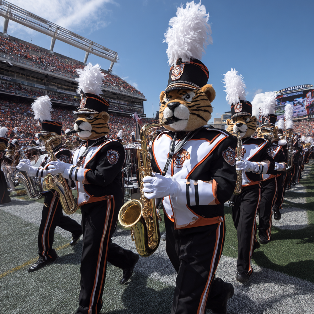 live college marching band’s brass, sousaphone, woodwinds, and percussive drumline, Rapid, syncopated snare rolls and battalion-style bass drums fuel the relentless high BPM pulse, Dynamic band breaks build anticipation between explosive, rapped sections