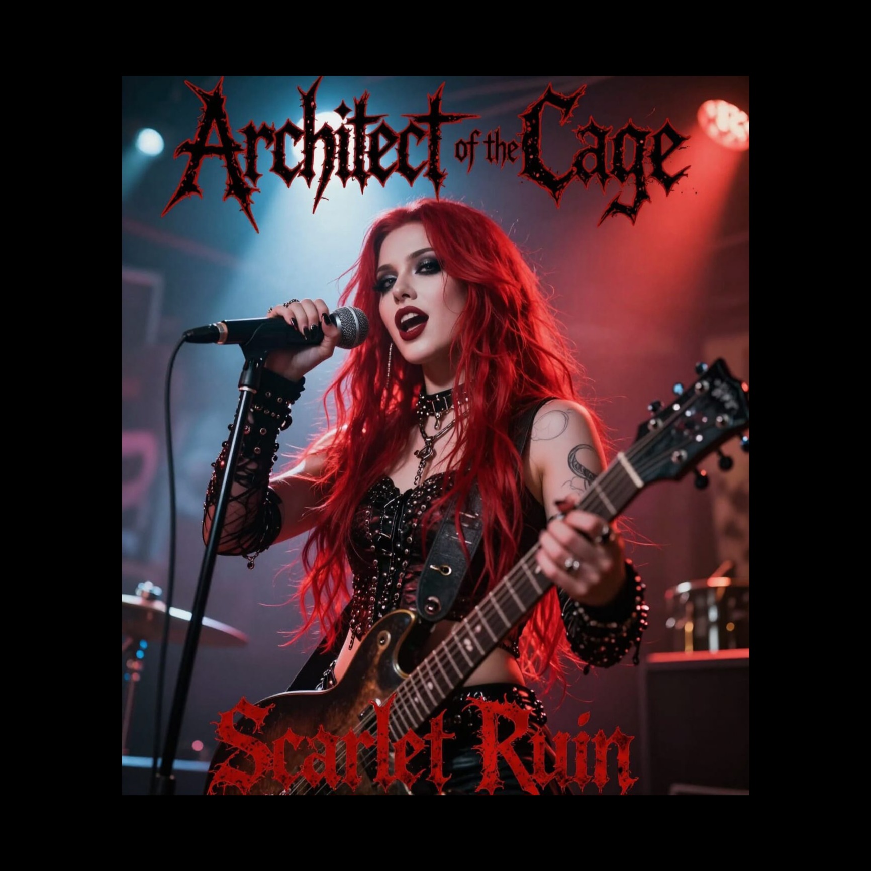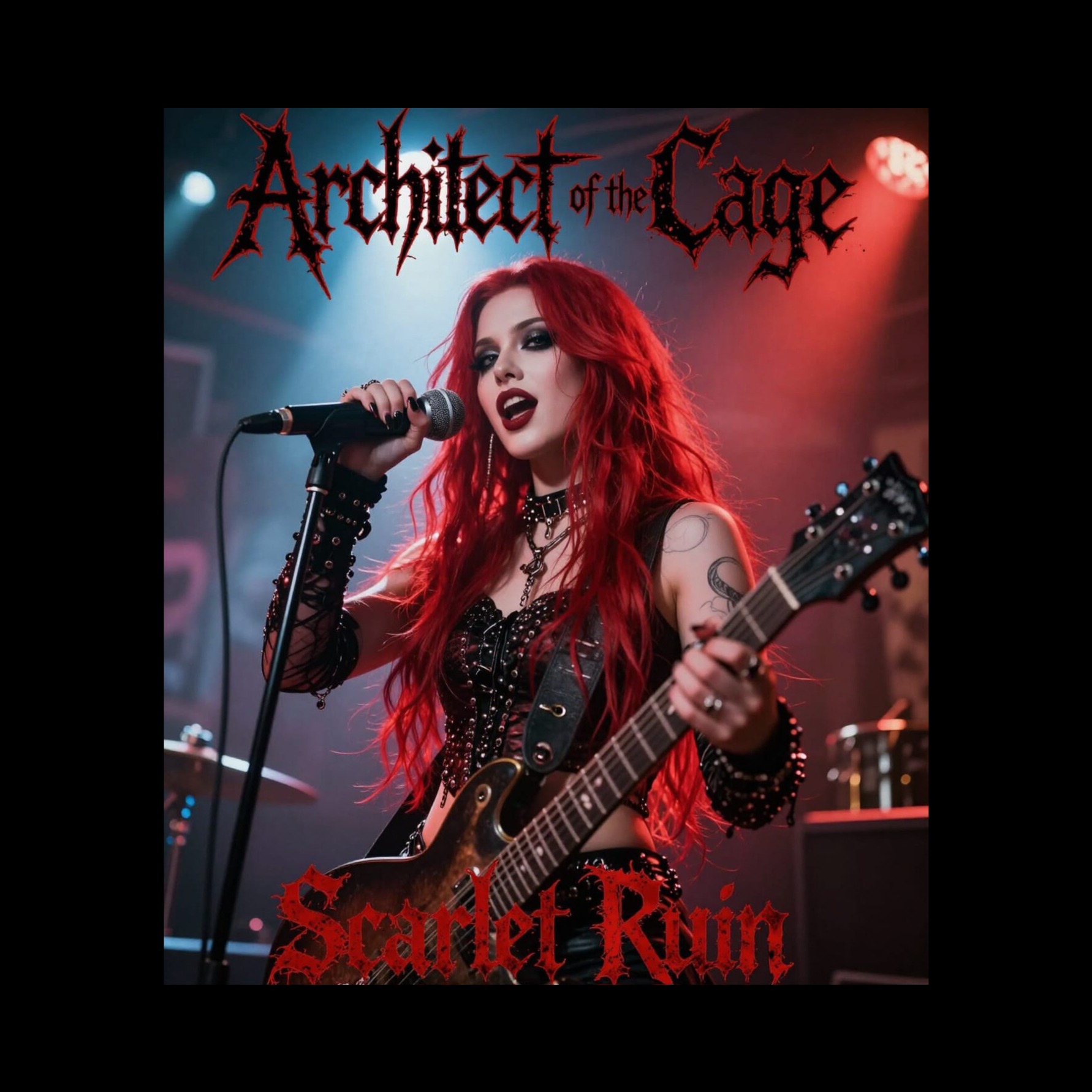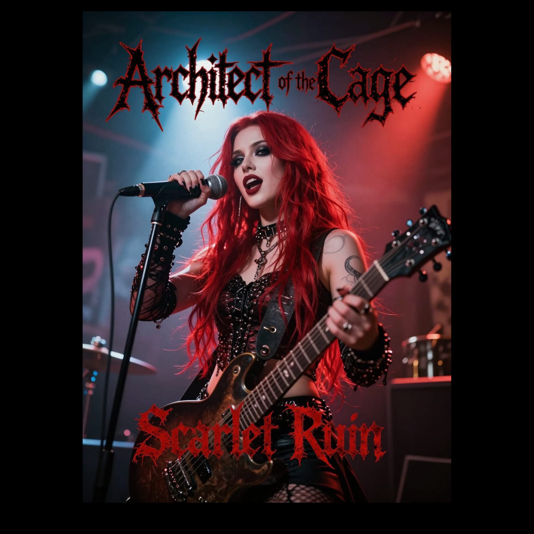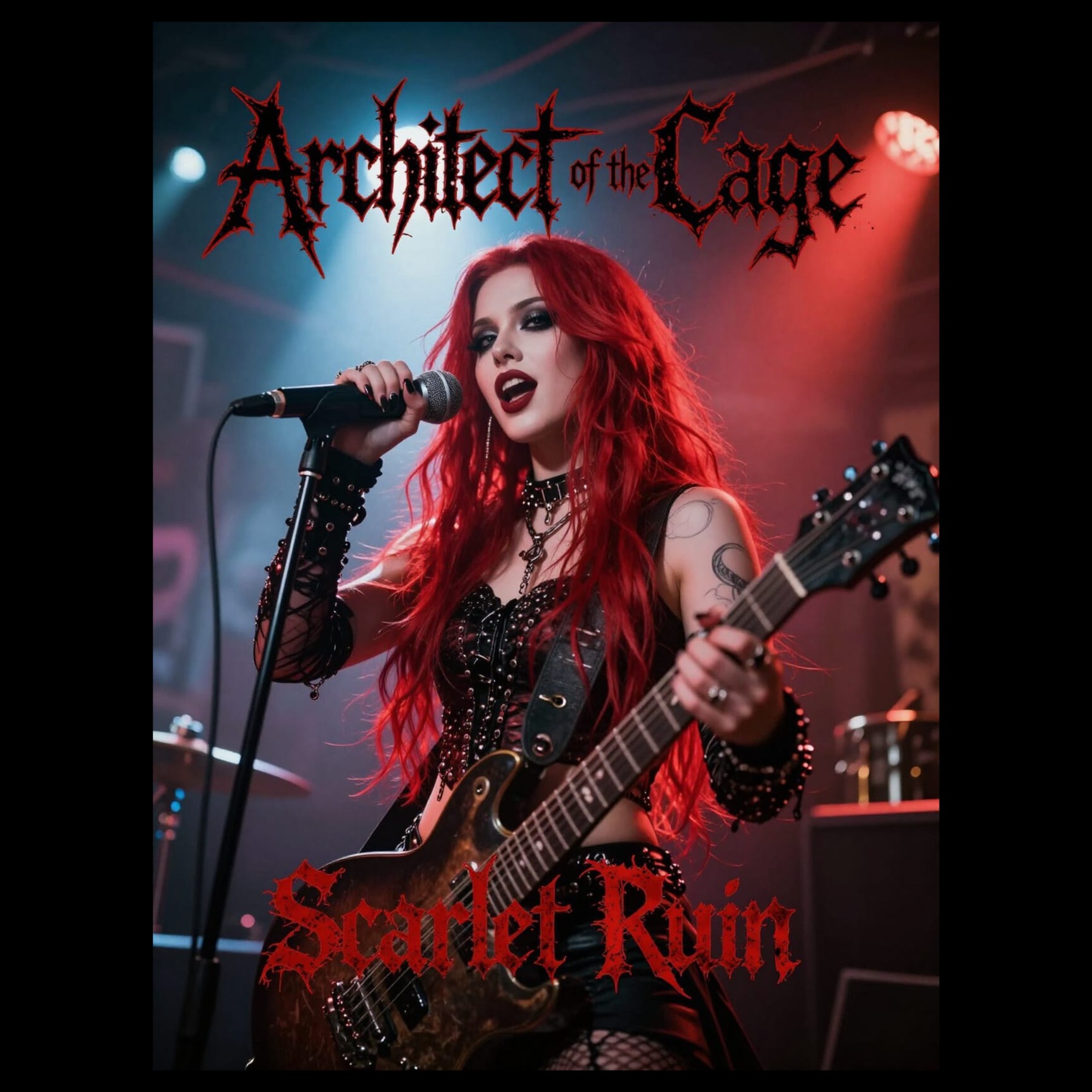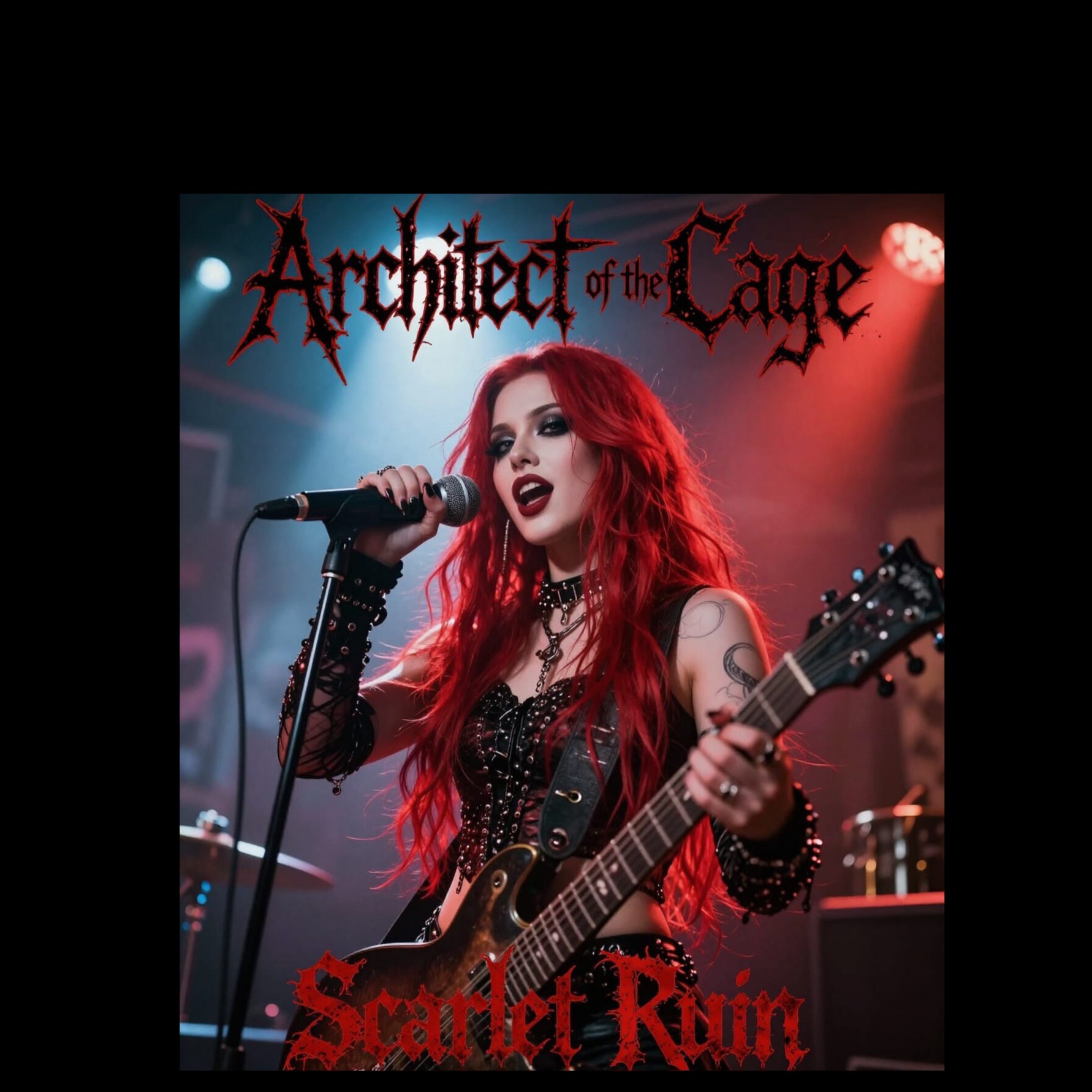 melodic dark metal, modern industrial metalcore, fast tempo 170โ190 BPM, minor key tonality, aggressive downtuned guitars, rapid double-kick drums, electronic dance synth layers and side-chained bass pulses, club-influenced rhythmic breaks, female clean lead vocals with second female harsh scream vocalist, alternating lines and call-and-response, anthemic pop-style hook chorus, tight modern metal mix, crisp drums, heavy low-end, avoid male vocals