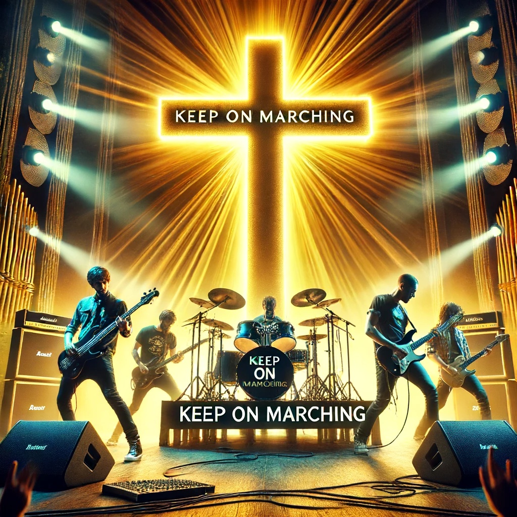 electric guitars, drums, strong beat, male vocals, strong power chords, hard rock style, high energy, anthem