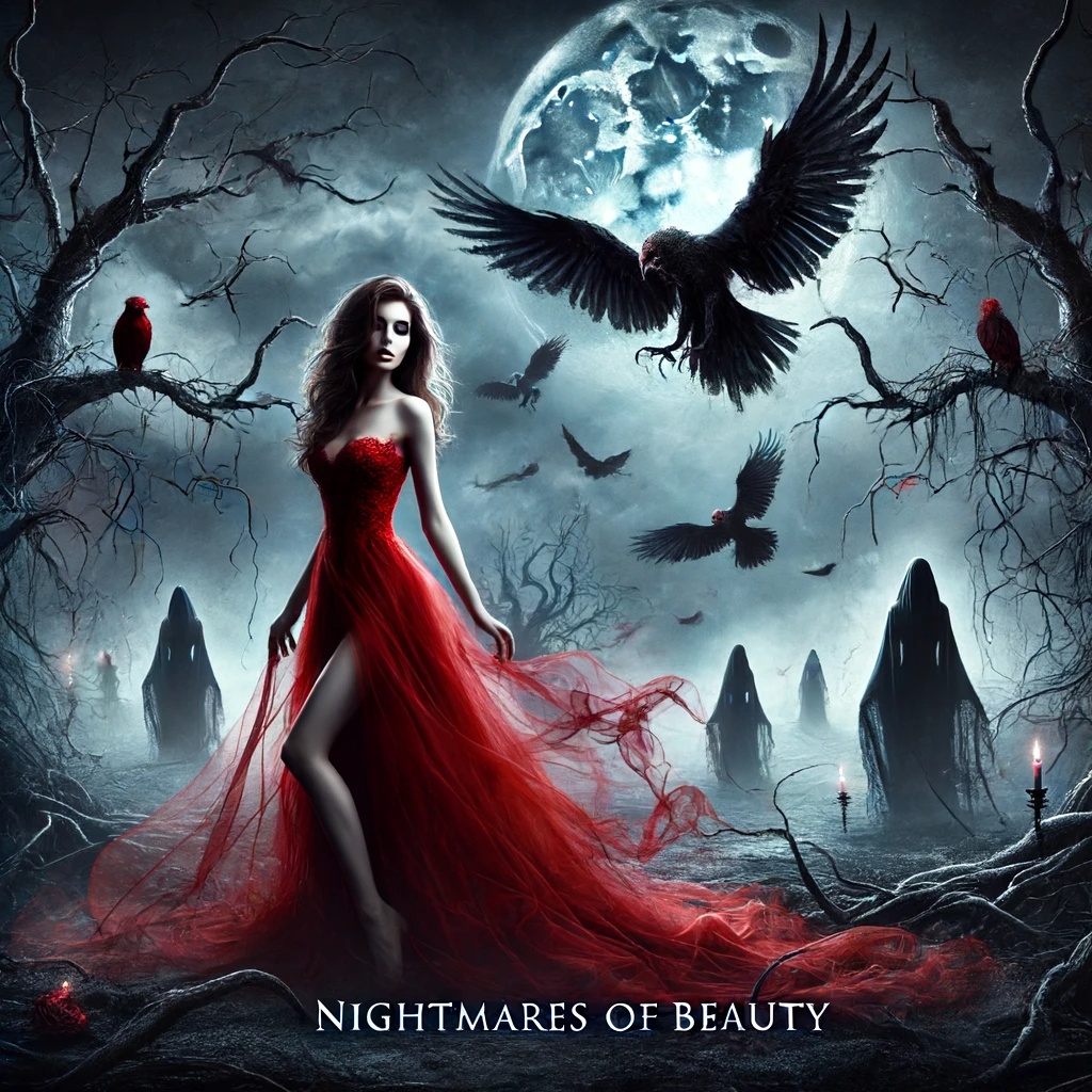 minor key, dark gothic strings, bass heavy, desperate and emotional, female vocals, big sustaining notes, touch of metal