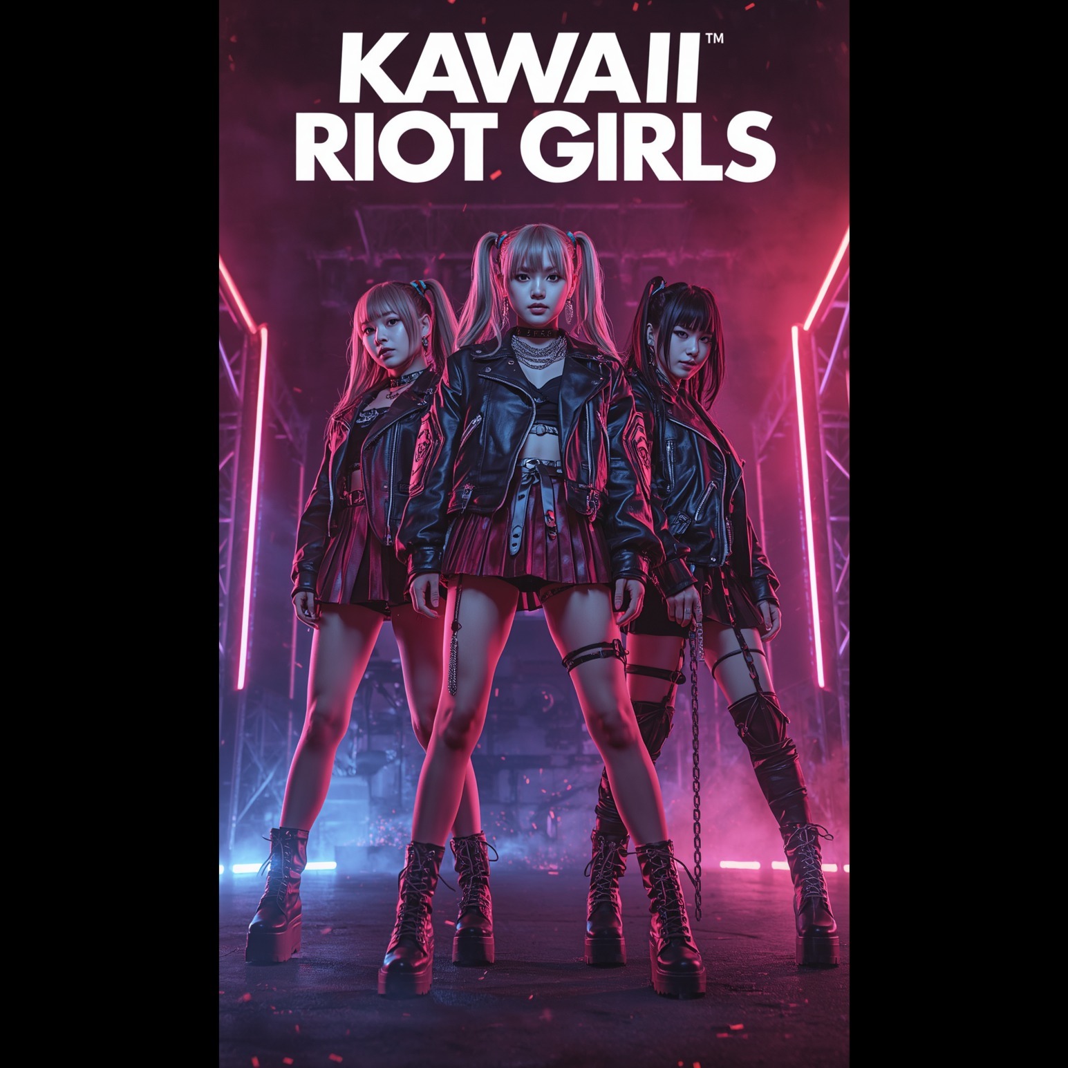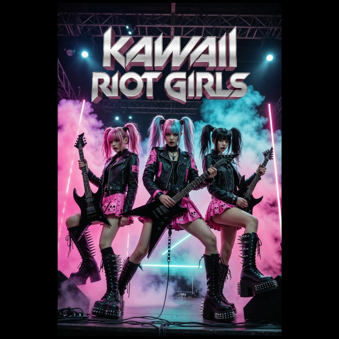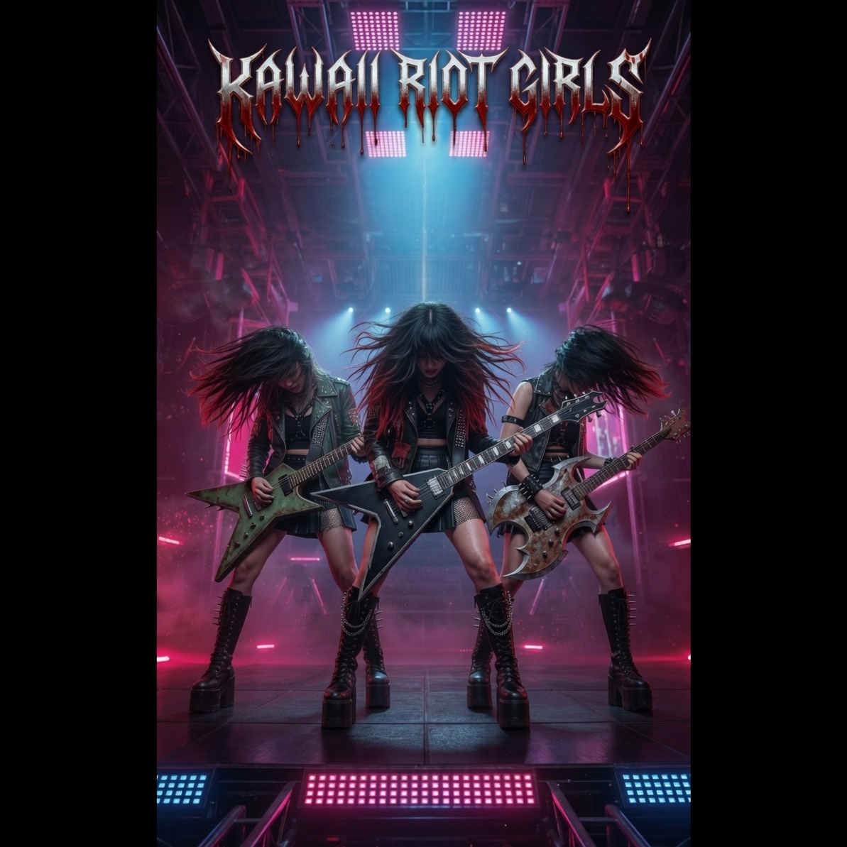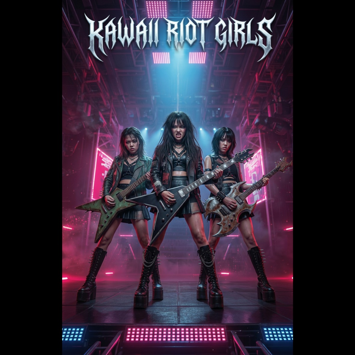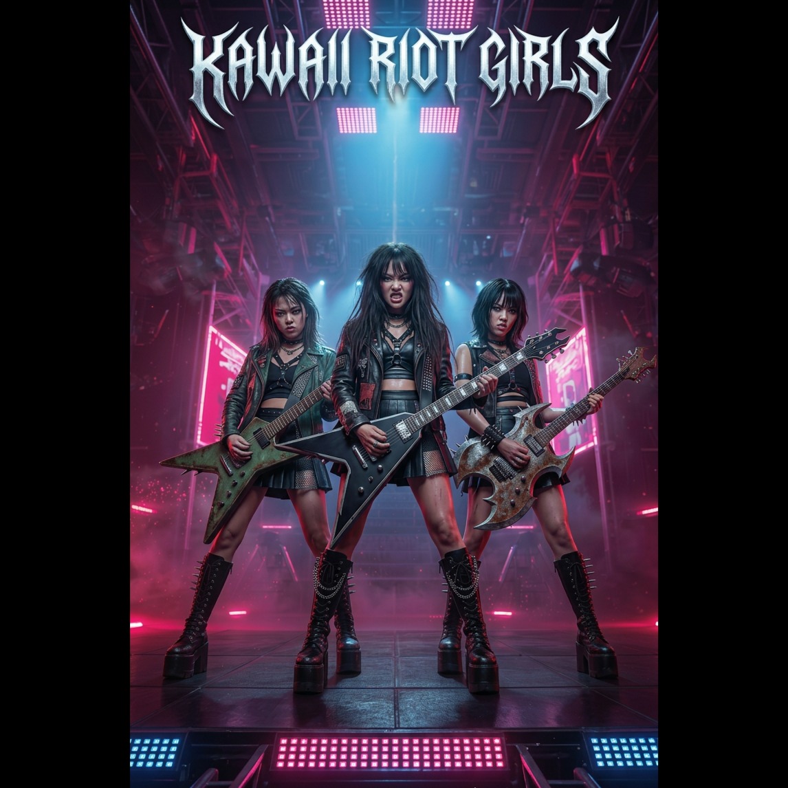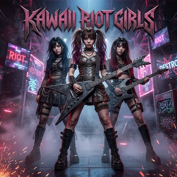 Core sound: kawaii metal with melodic metalcore and nu-metal energy, trash metal, very tight and technical, dual real distorted down-tuned guitar riffs left and right, tight palm-muted chugging guitars, Production: studio-mastered, full-frequency rock-metal sound; clean, powerful mix with heavy drops and crowd impact, Lyrics & mood: defiant, bratty, and hype; turns shame, criticism, and control into group-energizing release, Vocals: 3 female vocalists: 1 clear and powerful lead voice always upfront, 2 raw female screamers for aggressive call-and-response