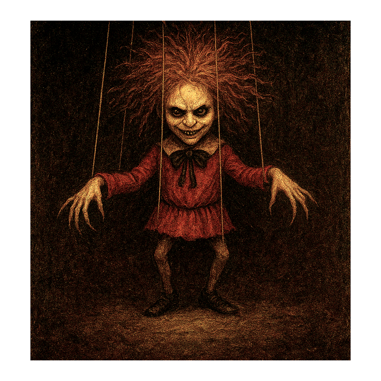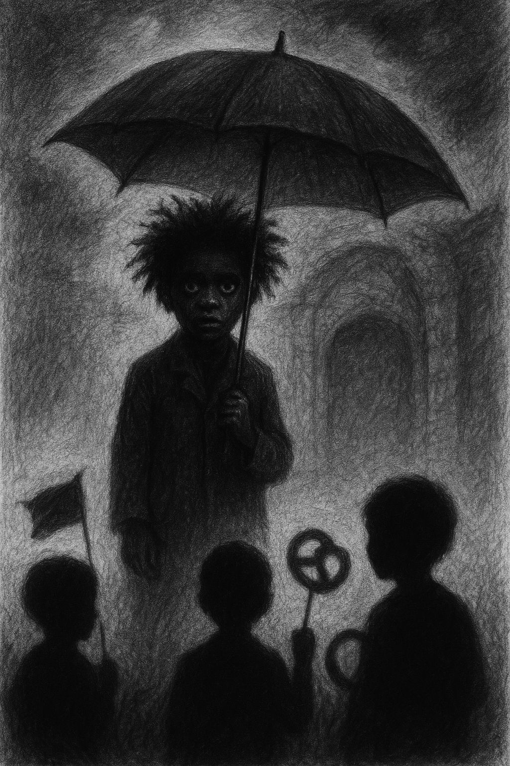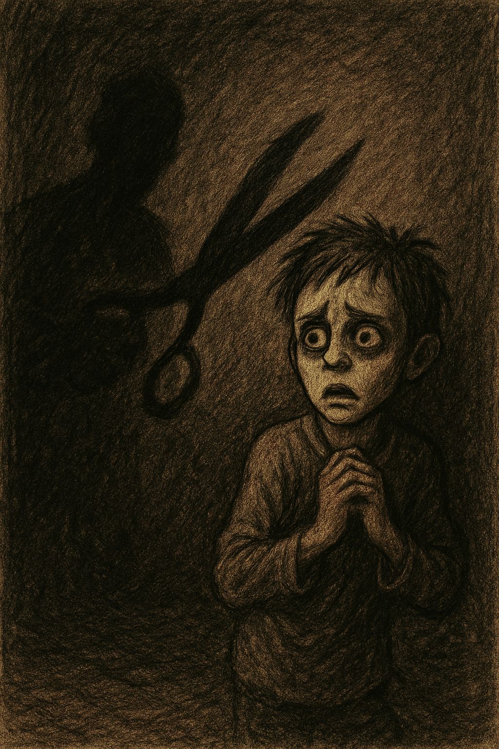 This is a dark atmospheric, horror-inspired 'Neue Deutsche Härte'-style song called 'Struwwelpeter' with a heavy, slow industrial beat, Aggressive, riff-driven electric guitars, deep bass, hard drums with prominent snare and tom accents, Vocals in german, deep, powerful, theatrical, with emotional intensity, Arrangement dynamic: tension-building in the verses, epic chorus, breakdowns with horror sounds for scary effect, scary melody played by a detuned musicbox, Atmosphere is dark, grotesque, horrific, slightly menacing and full of dispair, with a sense of dark tragedy, Include many instrumental solos, especially synthesizer solos
