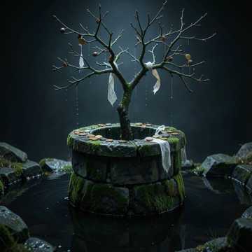 ancient celtic, mystical folk, ireland scotland, female ethereal vocals, haunting harp arpeggios, soft bodhrán pulse, tin whistle laments, uilleann pipes whispers, gentle acoustic strings, slow mid-tempo, sacred well atmosphere, votive offerings, otherworldly wisdom, pagan mysticism, healing and curse