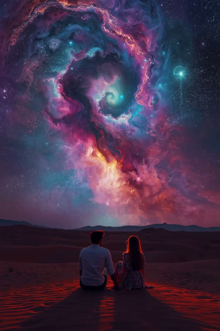 Playful psychedelic desert-cumbia at 88 BPM in D minor, 4/4 with pronounced syncopation and joyful swing, Immersive 360ยฐ binaural/Atmos-ready mix with ultra-clear separation and high dynamic range, Warm vintage bass centered and tactile, soft kick and brushed snare anchored in mono, Lively Ecuadorian-style congas and wide stereo shaker with subtle circular automation, Two clean electric guitars in rhythmic call-and-response, spring reverb and light tremolo, gently panned L/R, Prominent Andean quena flute with airy tone, melodic counter-lines and spatial movement front-to-back, Ethereal breathy female falsetto harmonies layered wide stereo with floating rear reverb tails, Brief harmonic lift to F major during upbeat instrumental solo, Analog warmth, pristine clarity, expansive desert atmosphere โ intimate, flirtatious, body-driven dance under a vast cosmic horizon