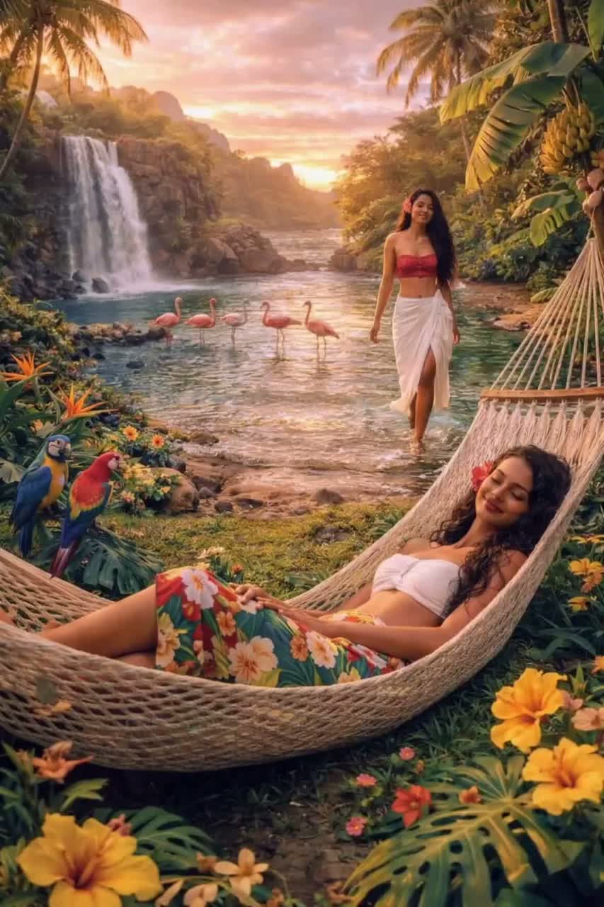 Exotic joyful bright psychedelic tropical pop at 92 BPM in 4/4 with syncopated congas forward in the mix, soft mono kick and brushed snare, Warm vintage rounded bass centered and tactile, flowing like water, Expressive Ecuadorian-style congas with subtle fills and wide stereo shakers, Soft fuzz electric guitars with light wah and tremolo in call-and-response with airy Andean quena flute moving in depth, Glowing analog synth pads with gentle phaser and warm Hammond organ layers, Tropical ambience (waterfall, parrots, jungle textures) integrated rhythmically, Ethereal female lead vocal soft-clean and radiant, playful tone; wide stereo falsetto harmonies with floating rear reverb, Immersive 360ยฐ binaural/Atmos-ready mix, ultra-clear separation, high dynamic range, Luminous, sun-drenched, body-driven, cinematic yet minimal, continuous warmth and presence, happiness