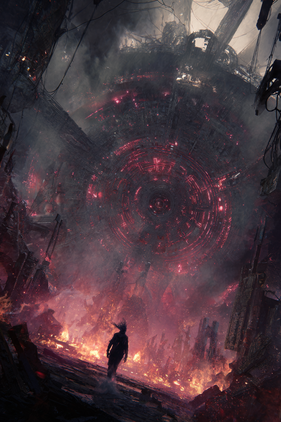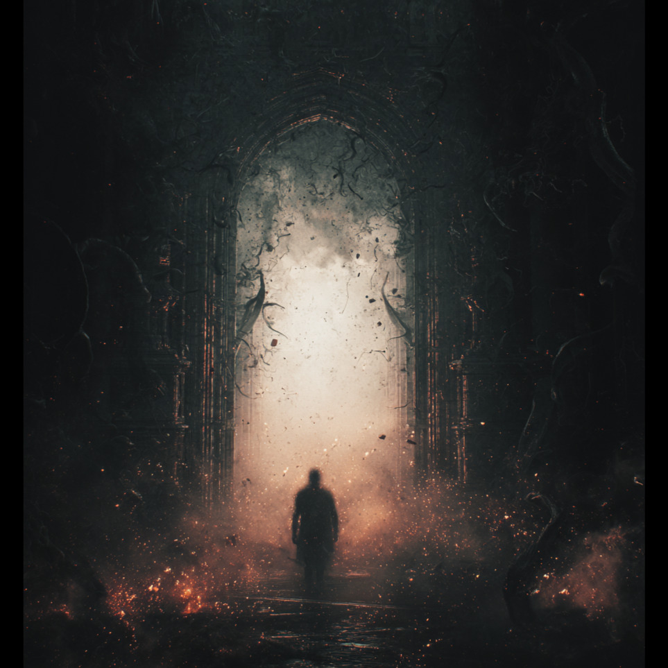 Opens with dense dark textures, layered drones, eerie symphonic swells, tribal percussion, and metallic scrap hits, Builds into a relentless 4x4 techno-metal drive—earthquake kick, grinding synth bass, deep, ultra-distorted guitars, Mechanical noise and orchestral stabs punctuate each transition, Vocals start as guttural human growls, mutating into twisted, processed inhuman roars, Midway, warped retrowave synths and orchestral horror cues intensify the mania, Finale explodes in a cyber-rave chaos of industrial rage, brutal energy, and haunting cinematic scope