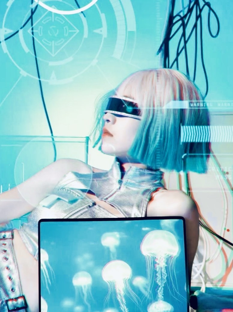 J-pop, Scratching on the turntable, Psychedelic, Futuristic Electro Funky House at 120 BPM, cyber-glitch mix with funky Moog bass, Psychedelic, Chinese style, Pentatonic, tension cord, bossa Jazz, french house, punchy kicks, and robotic synths, Vocoded male & female vocals, robotic and rhythmic, Catchy hooks, glitch bridges, and metallic effects, loop-friendly, retro-futuristic vibe, and visually cinematic, soulful husky famale & male smooth voice, sweet male & female vocal whisper clean voice, Layered female & male harmonies