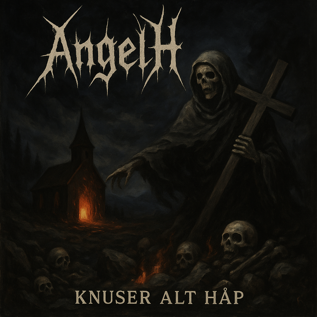 Raw, aggressive black metal with death metal influences, The sound should be dark, atmospheric, and violent, with blast beats, tremolo-picked guitars, dissonant chord progressions, and guttural screams/growls, Emphasize ritualistic and blasphemous tone, Keep tempo around 180-220 BPM, Blend atmosphere and brutality, Language is Norwegian – keep vocals raw and dark