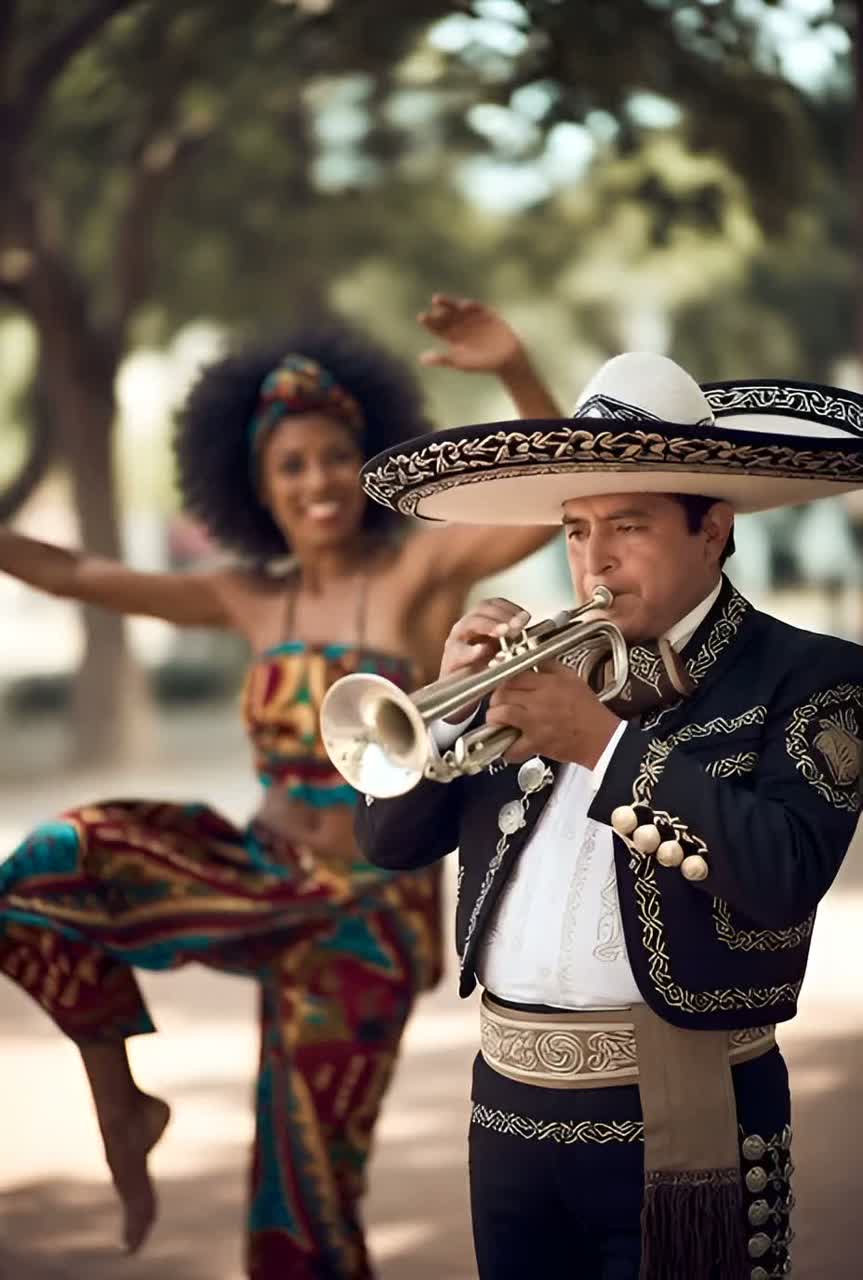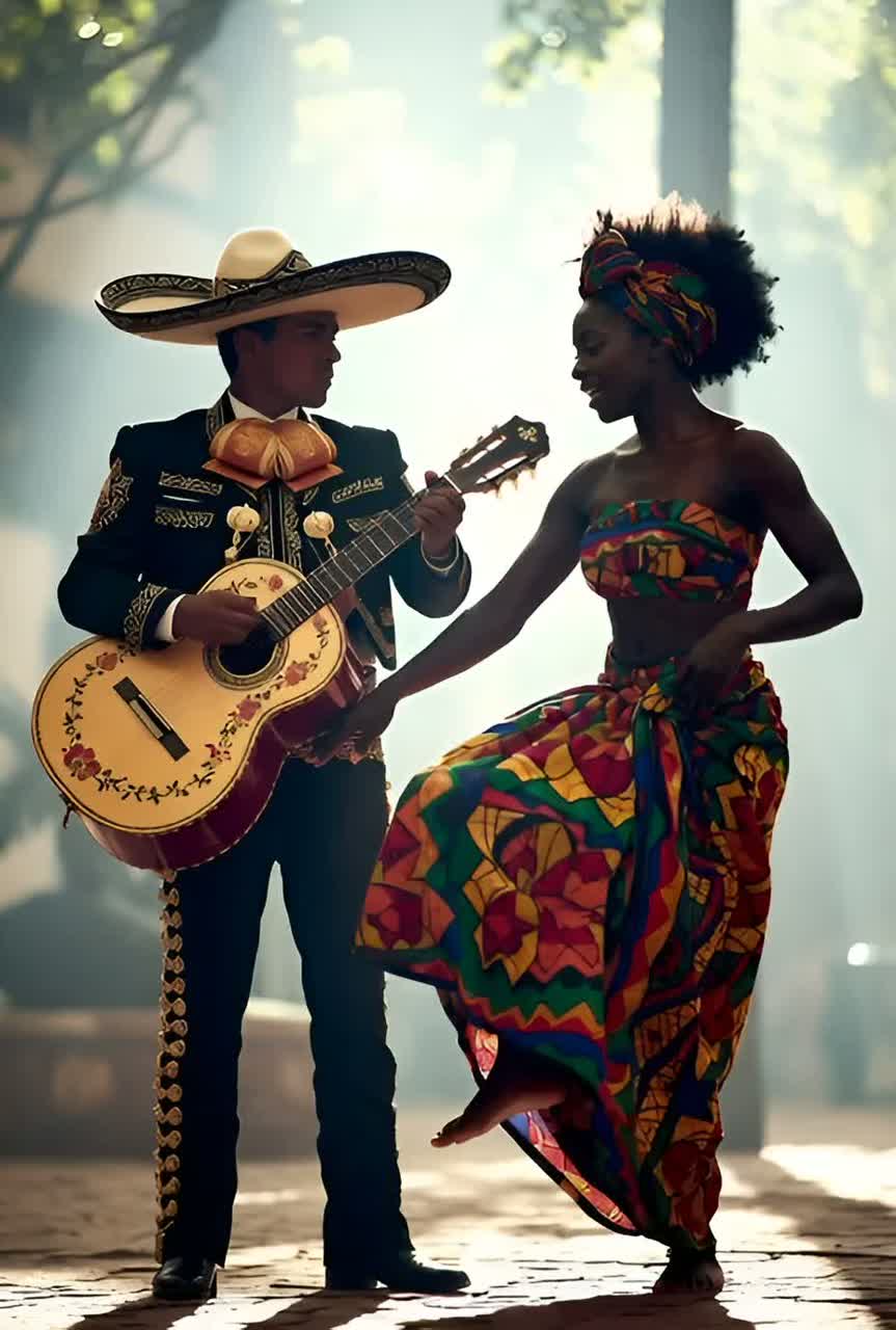 Afro-House / Latin Tech Fusion 🌍🎺, Flamenco Guitar 🎸, African Tribal Rhythms, Kikuyu Solo Vocal 🎤, Mexican Trumpets, Mid-Tempo, Classic House Beats 🥁 (electronic/authentic percussion combo), Strong Tight Bass 🕳️, Spatial Synthesizers, Male/Female Choir, Catchy Music, Cultural Fusion Vibe