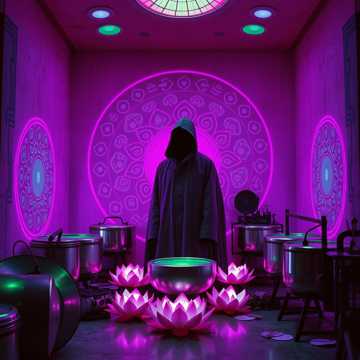 gamelan + various gongs and metallic xylophone like purcussions, super high tone Hypnotic Yoruba-style male vocal with rich choral chanting, + heavily layered unizonic vocals, ultra twisted dub, dreamy + loopy