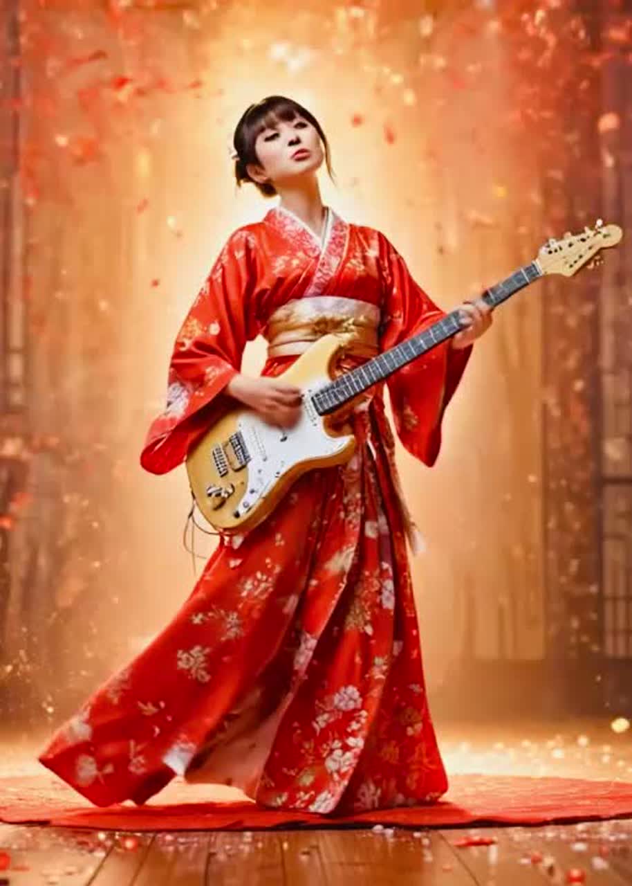 Modern Japanese alt jazz–rock–ska with a Taisho cabaret atmosphere, Tempo 132 BPM, key E minor, Swinging verses: upright bass, brushed drums, piano, alto sax; pre-chorus adds shamisen/koto flourishes and muted trumpet; explosive chorus shifts to rock-ska with distorted guitars, skanking offbeats, tight horn stabs, Female lead—smoky, theatrical, sly yet bold; backing vocals call-and-response, Themes: lantern glow, lipstick, street shadows, forbidden love, defiance, Jazz extensions (9ths/13ths), chromatic runs, sudden modulations, half-time bridge, dramatic breaks, Percussion: taiko-like toms and swing snare; from walking to picked, Brief talk-sing rap in the middle eight, then a wah guitar solo, Warm tape saturation, room reverb; seductive, dangerous, triumphant; end with a-dawn piano–sax coda