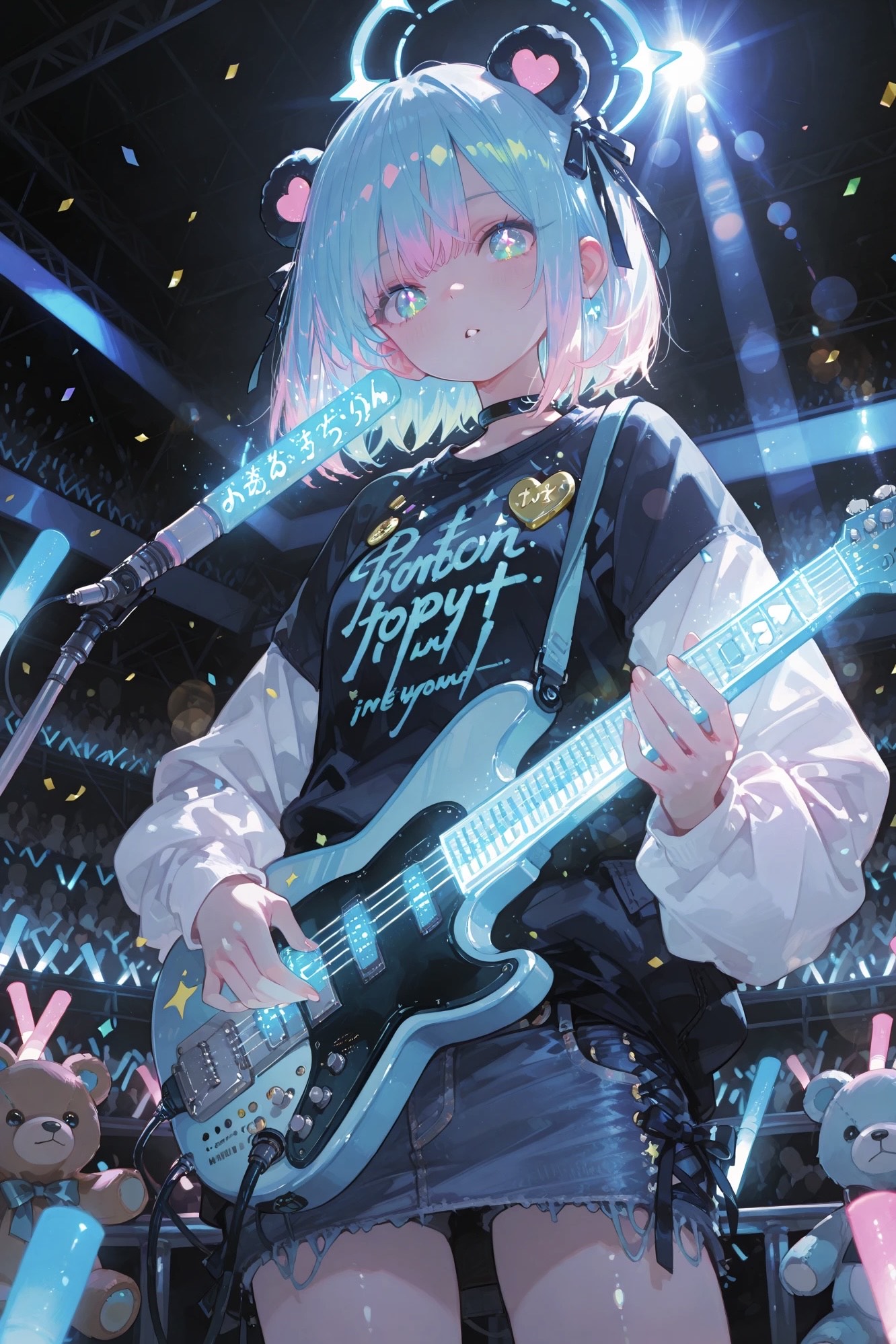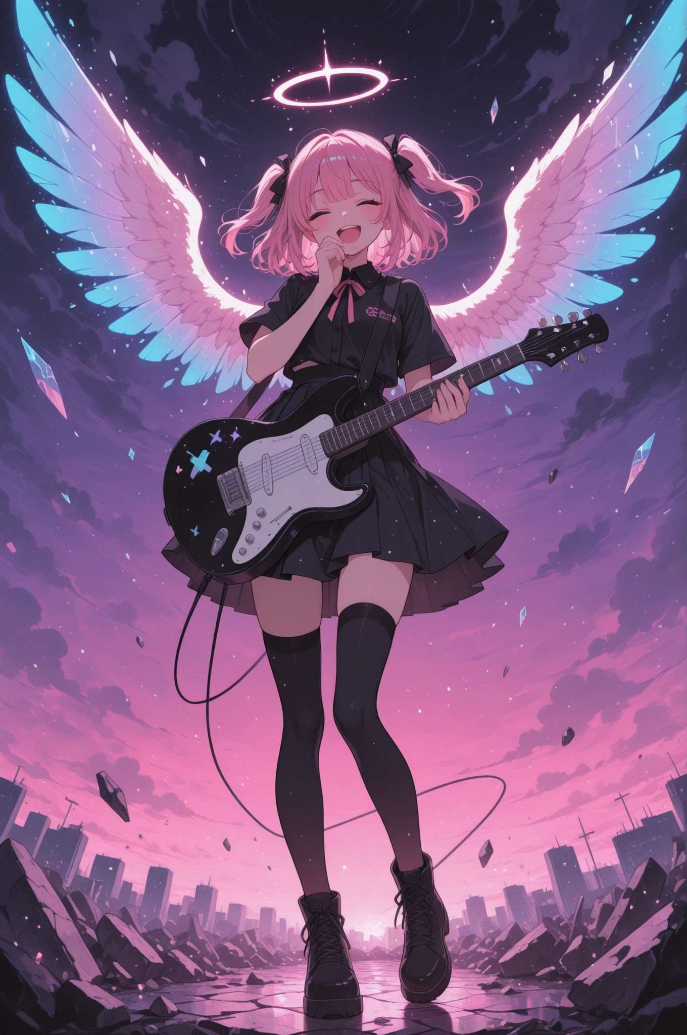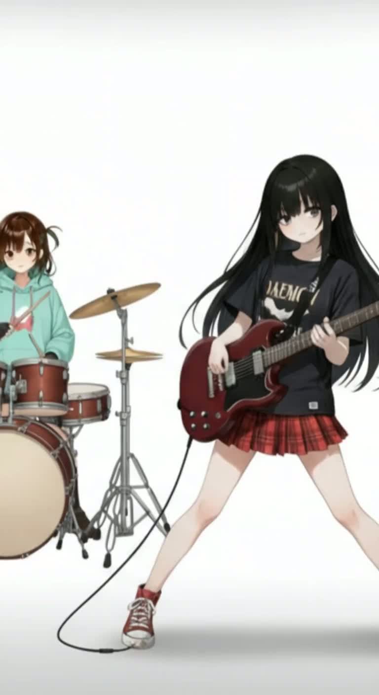 A high-energy digital rock × kawaii idol pop × chaos fusion track featuring multiple animated kawaii female vocalists trading fast call-and-response lines, stacked harmonies, and glitchy vocal chops, Guitars (Les Paul + Telecaster) deliver bright overdrive riffs with bitcrushed stabs, while heavy digital drums and 808 hits merge into a hard but cute groove, Bass is thick, sidechained, and slightly detuned for edge, Vocals range from playful whispers to confident shouts—each layered for a 3D chorus wall, Sections evolve unpredictably with tempo shifts, tape stops, and reverse risers that explode into wide stereo choruses, Every line feels spontaneous, like a freestyle jam between hyper idols in a digital storm, FX design blends vinyl crackle, reversed claps, spectral shimmer, and glitch bursts to create “controlled chaos, ”