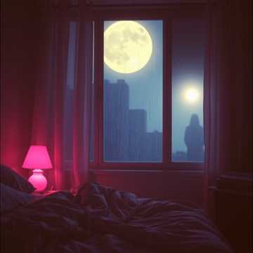 Slow-bloom synthwave ballad at ~85 BPM, male vocals low and intimate, Warm analog pads swell and detune gently, with a soft pulsing bass on 2 & 4 as a muted heartbeat, Shimmering, evolving arpeggios drift like rain-streaked light across the stereo field, Vocal drenched in distant reverb, close in tone but far in space, Final chorus widens with airy choir swells and subtle counter-melodies, then everything falls back to a fragile pad and single echoing note, low, slow