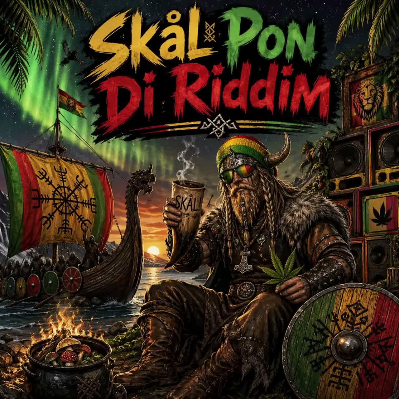 Epic fusion of deep dub reggae and raw dancehall riddim fused with ancient Nordic medieval folk and Viking battle energy, Heavy booming sub basslines, skanking off-beat guitar chops, thick echoing delays and reverb on every hit like a smoky longhouse session, Layered with powerful Norse throat singing, deep male Viking choirs chanting ‘Skål!’, medieval horns and lur blasts, clashing shield percussion, and distant war drums, Add Nordic EDM festival drops with soaring synth leads and pulsing sidechain, Trippy, mystical atmosphere with mushroom-fueled psychedelic swirls, Raw, celebratory, warrior-party vibe — half plunder, half irie one-drop peace, Male gravelly reggae-toast vocals mixed with fierce Viking shouts, Tempo around 85-95 BPM, heavy on the one-drop, fat low-end, and ancient-meets-modern fire