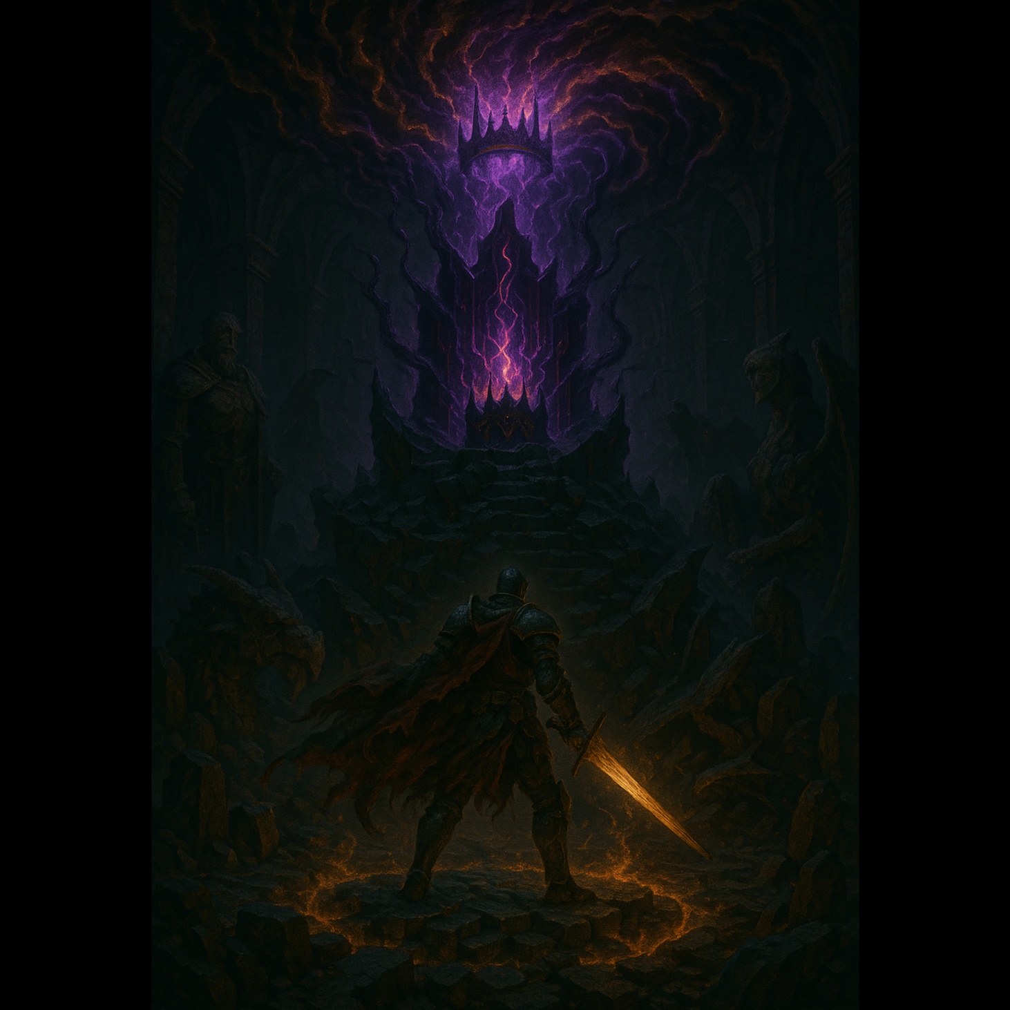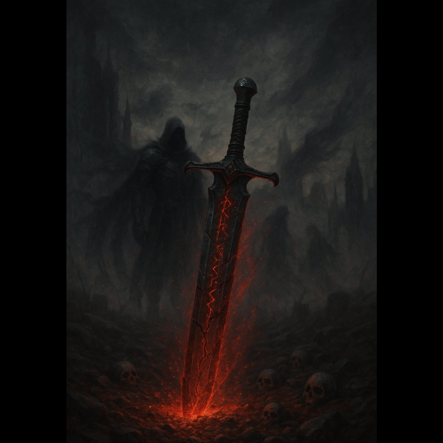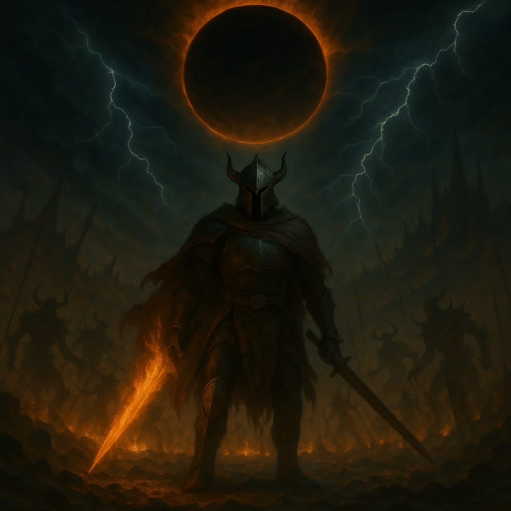 High-energy fantasy power metal with male lead vocals, cinematic choirs, fast double-kick drums, arcane synths, and intense guitar riffs, Epic magical tone with heroic despair, cursed weapons, and final battles, Sounds of metal clashing with fate, enchanted fire, and a tragic warrior’s last stand
