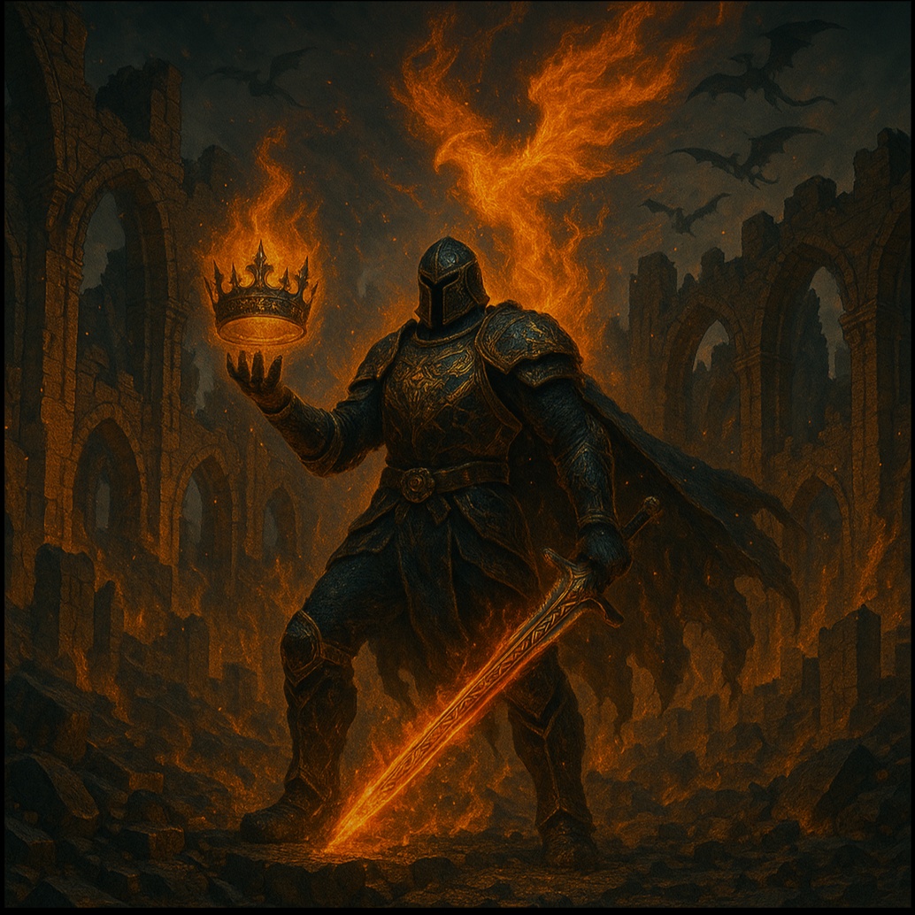 Epic fantasy power metal with dark orchestration, blazing guitars, dramatic choirs, intense male vocals, fire effects, and thunderous drums, Tragic and heroic, Burning crown, cursed magic, and rebellion rising against a tyrant king, Big cinematic energy, with both darkness and triumph