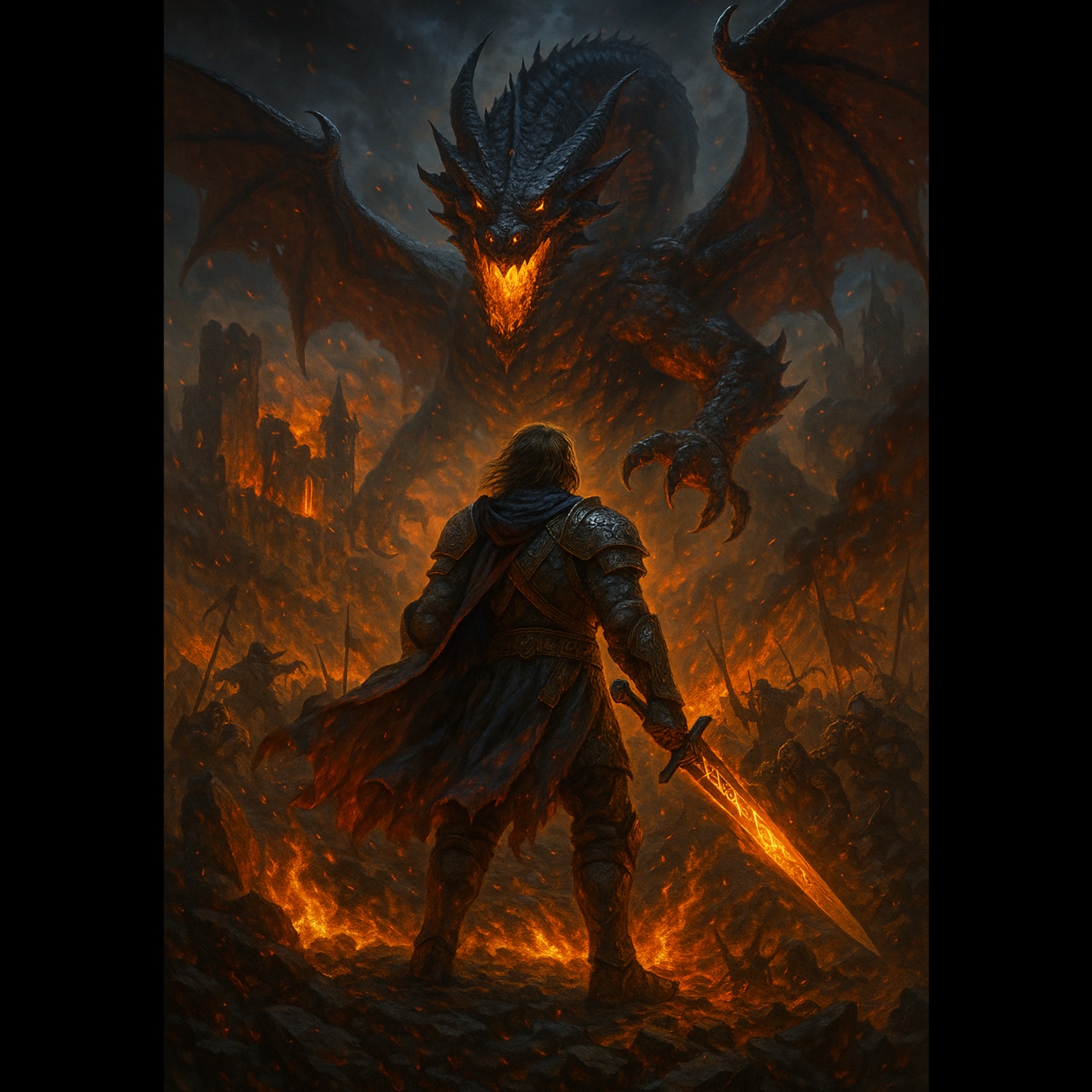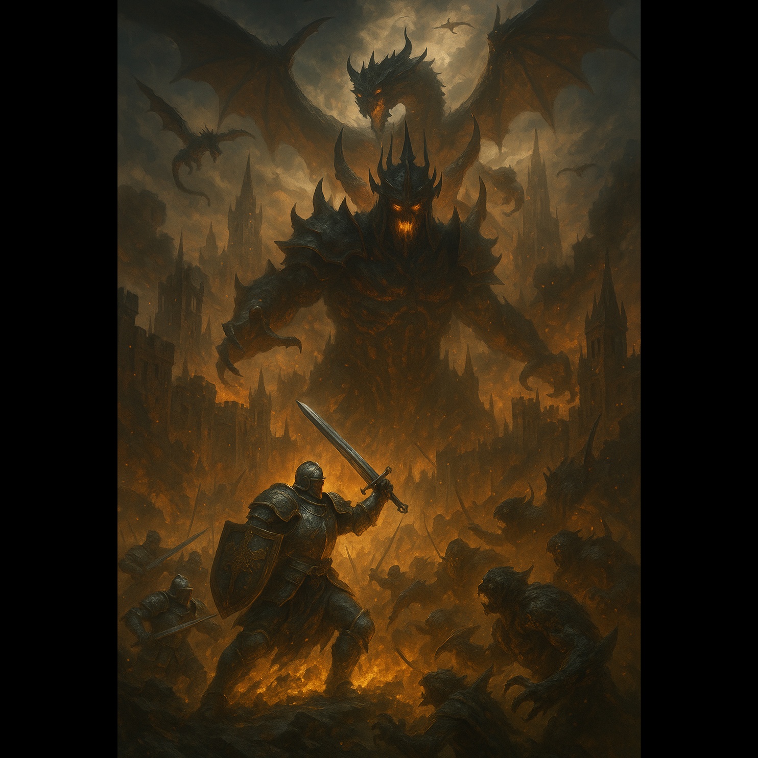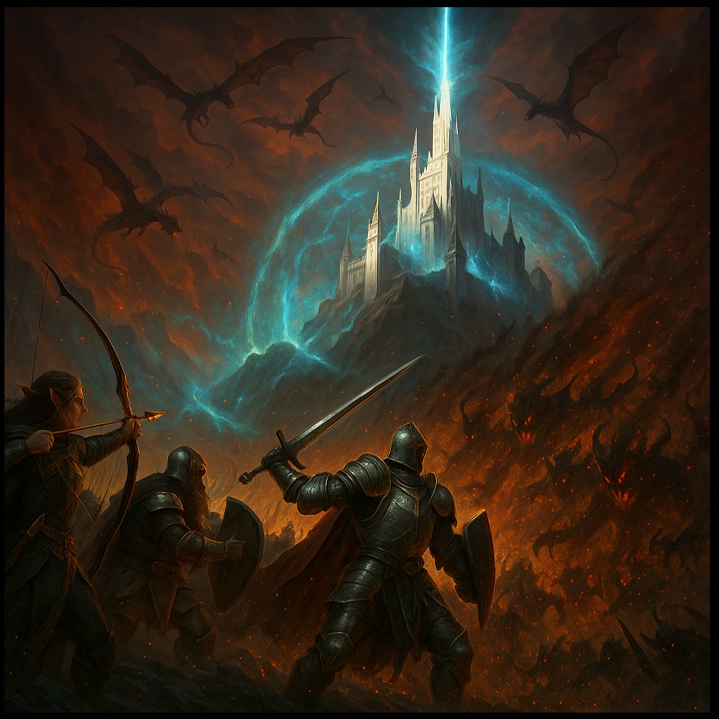 Dark symphonic fantasy metal with aggressive male vocals, epic choirs, infernal sound design, heavy guitars, and cinematic orchestration, Hellish invasion, magical resistance, thunderous rhythms, and apocalyptic fire, Inspired by demonic warlords, firestorms, and epic last stands