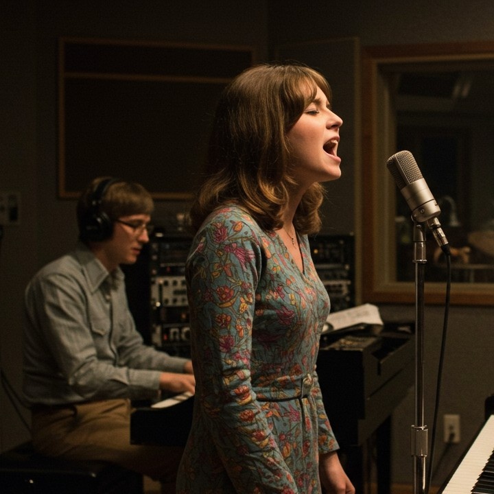 Late 60s/70s ballad, Haunting Introspective, Slow tempo, Smooth Longing and vulnerable female vocals, Piano/acoustic guitar with subtle strings/woodwinds, Warm, slightly melancholic mix, Gentle harmonies