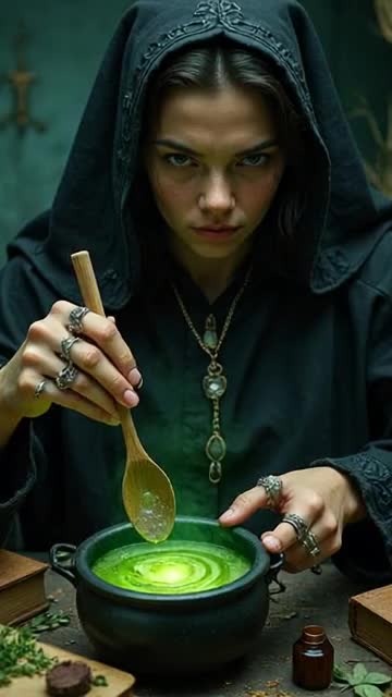 female comic cabaret pantomime villain witch devilish dark totally delighting in evil, evil laughing