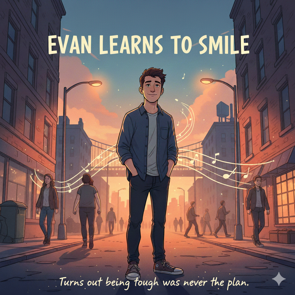 Create an indie storytelling ska-rock track: upbeat but reflective, with bright choppy guitar riffs, offbeat ska strumming, punchy syncopated drums, walking melodic bass, and optional light keyboard fills, Vocals should be earnest and narrative-driven, telling the story of “Evan Learns to Smile, ” a man who avoided smiling for years and finally lets himself smile, with subtle background harmonies on choruses, Structure the song with restrained, rhythmic verses, a building pre-chorus, energetic melodic choruses, an introspective bridge, and a reflective outro, Keep the vibe catchy, sincere, and lightly playful, balancing emotional storytelling with ska bounce