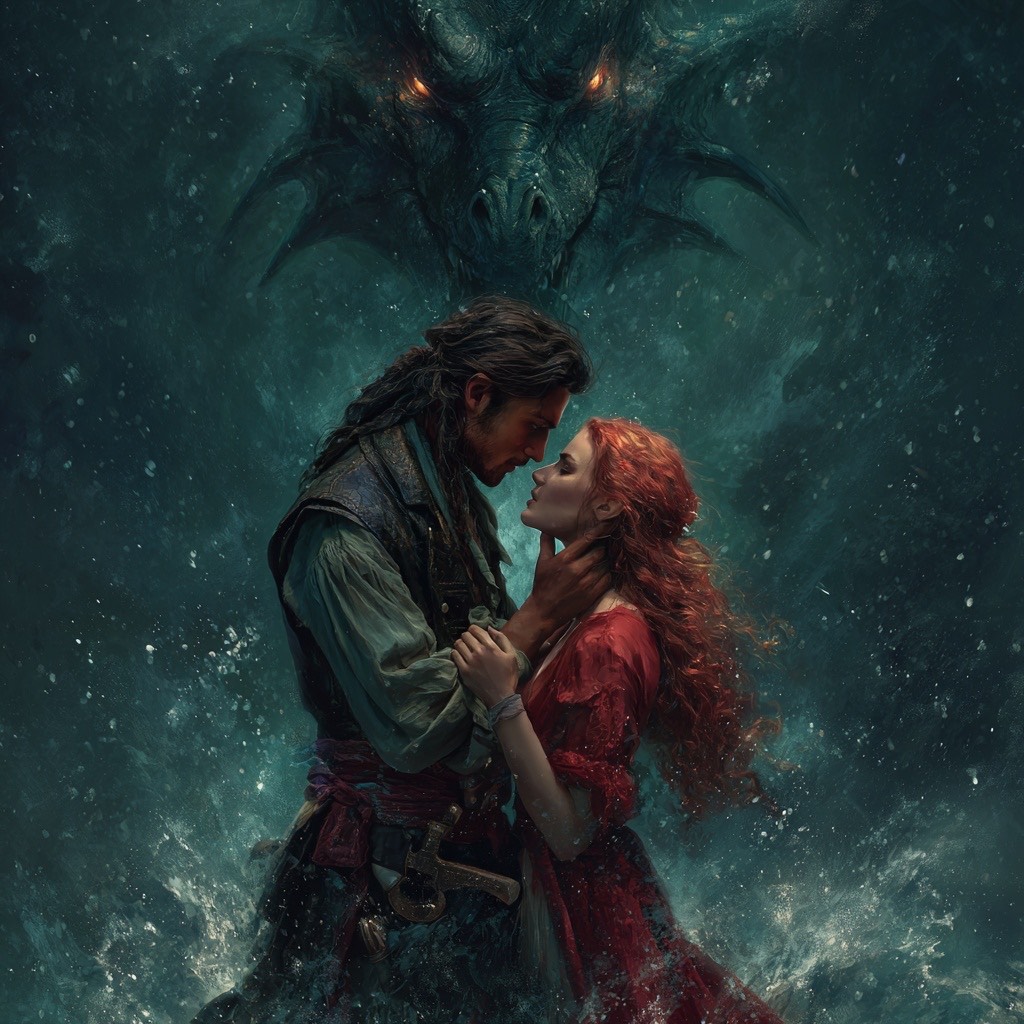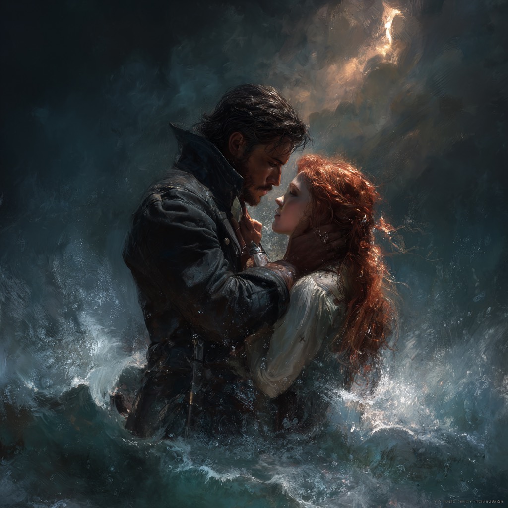 Dark cinematic romantasy rock ballad, Slow burn, forbidden love, Brooding male lead vocals—deep, restrained, emotionally controlled until explosive chorus, Cinematic orchestral undercurrent with low strings, deep drums, electric guitar, distant choir, Storm and fire imagery throughout, Lyrics about defying gods and the sea for love, Intimate menace, devotion, inevitability, Moody, epic, not pop, Slow build to powerful final chorus