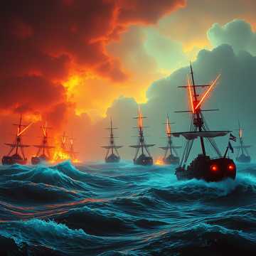 Dark cinematic fantasy score, Slow, ominous build, Low strings, deep brass, distant horns, Ocean drones, wind through rigging, faint thunder, Ancient magic beneath the sea, Minimal melody, Heavy atmosphere, No vocals