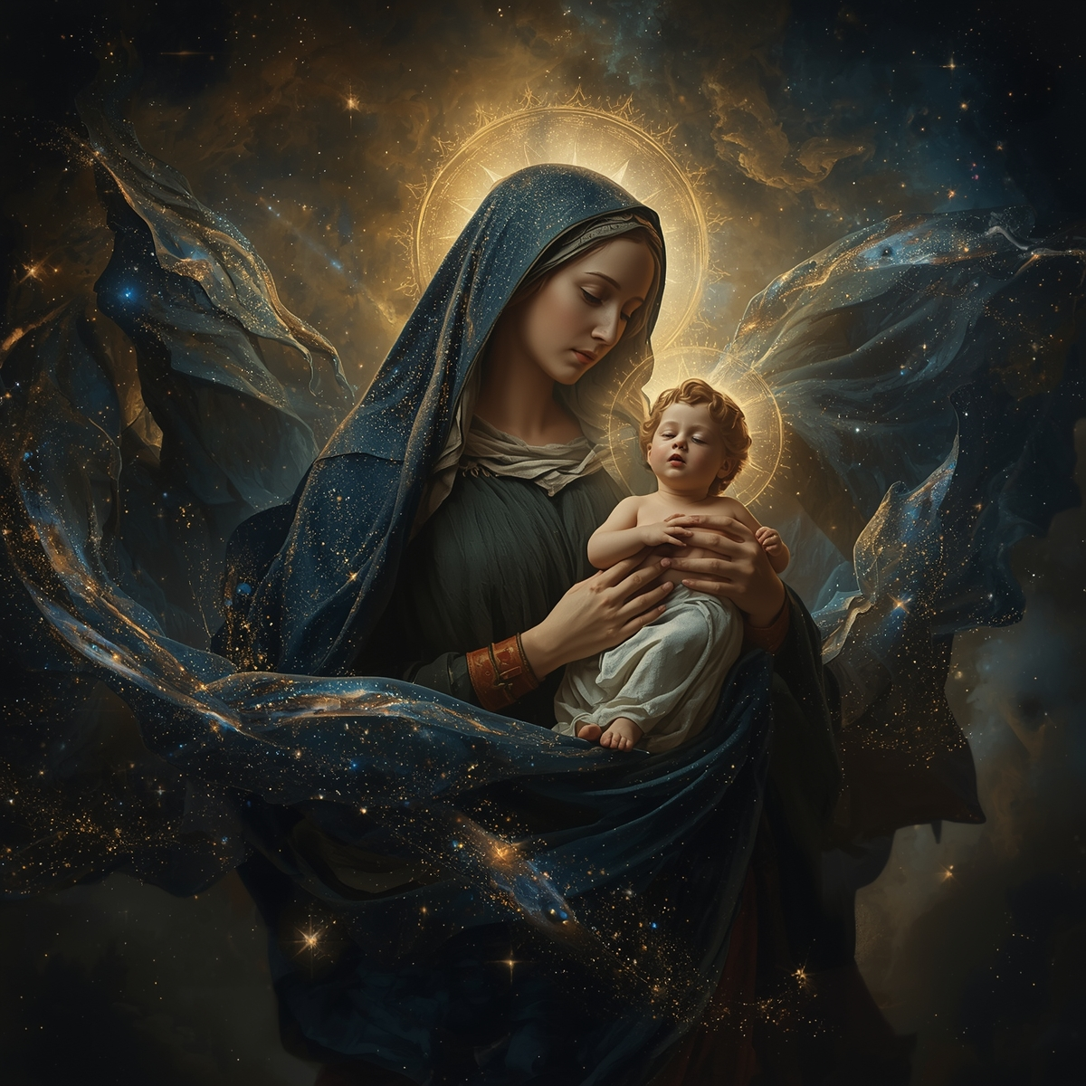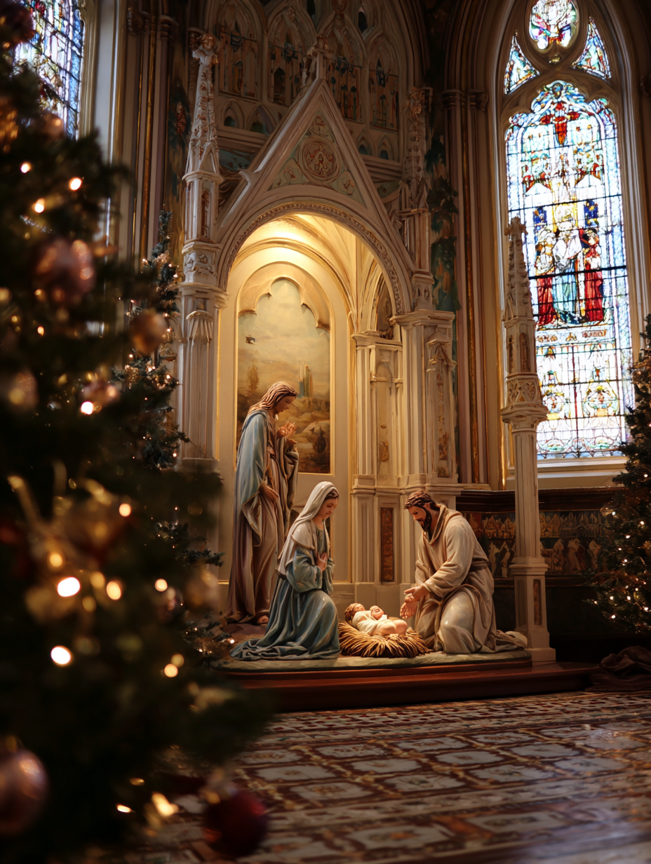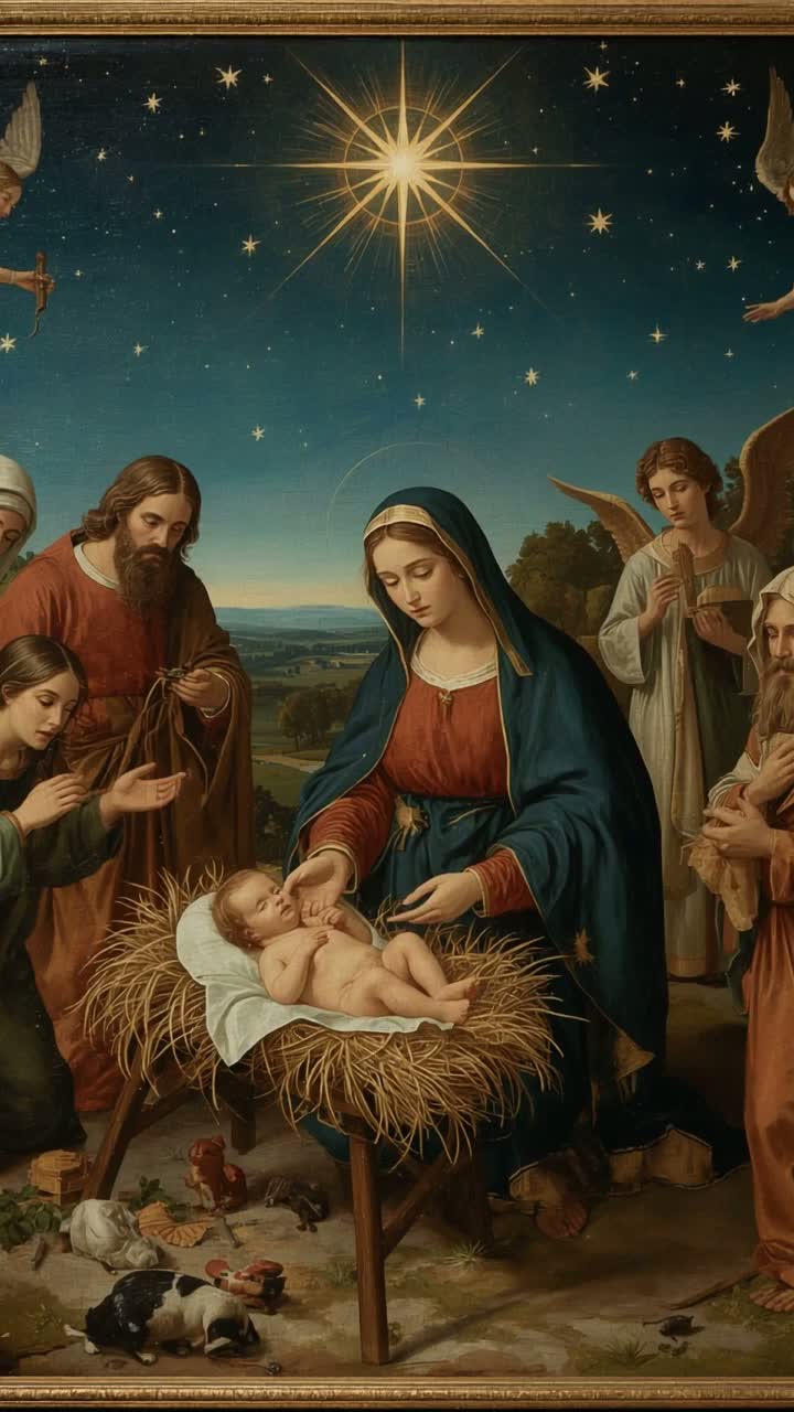 A bombastic and heavenly Christmas oratorio blending symphonic grandeur, sacred choral majesty, and operatic passion, A radiant fusion of harp, brass, and full orchestra joins a grand SATB choir and classically trained male–female duet in lyrical counterpoint and soaring call-and-response passages, The soloists lead verses with bel canto brilliance and intertwining melodic lines, answered by a vast choir in luminous polyphony and thunderous unison climaxes, Angelic harp arpeggios, triumphant trumpet fanfares, and resonant cathedral reverb evoke divine light, awe, and exaltation — a celestial celebration of holy joy, theatrical majesty, and transcendent winter radiance