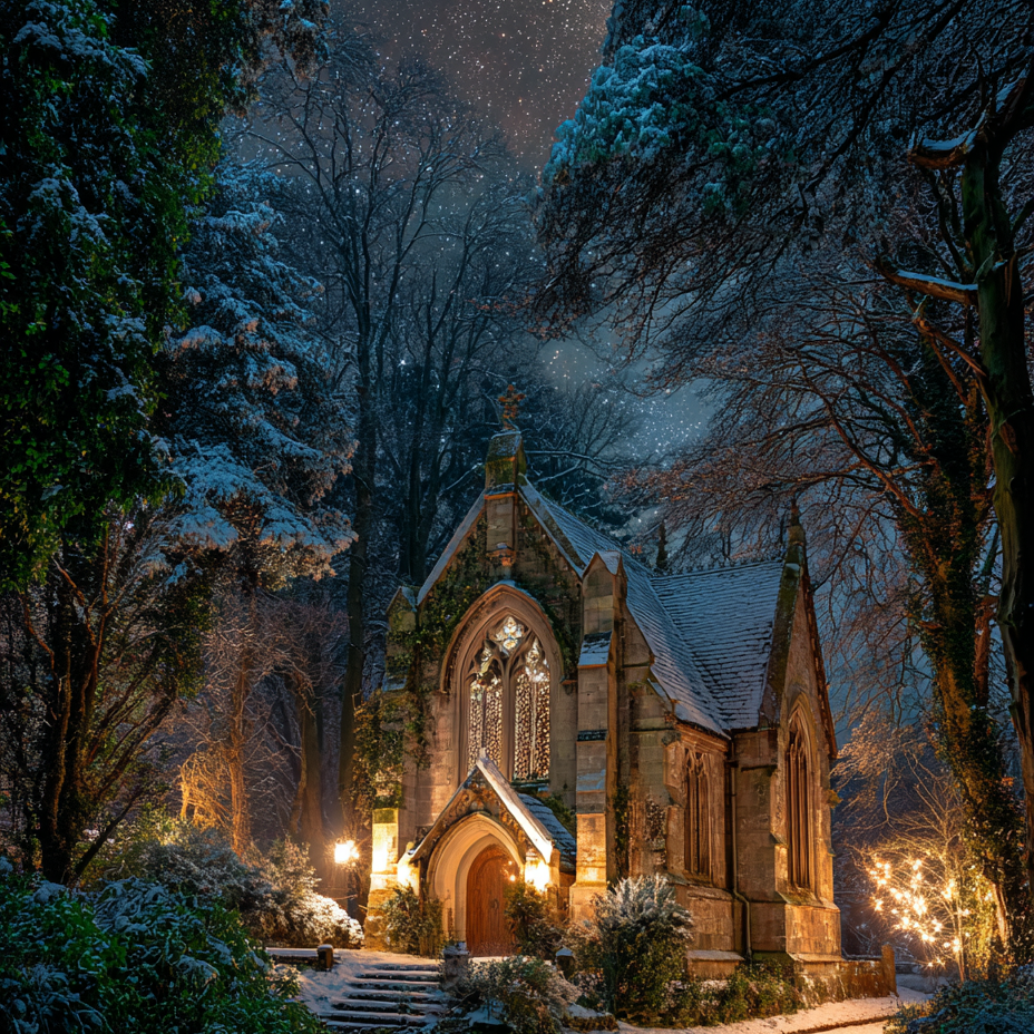 This mythic, atmospheric Christmas Celtic fusion piece evokes the ritual warmth of a midwinter procession beneath starlight, The arrangement opens with soft harp and celesta over distant church bells and shimmering analog pads, creating the hush of falling snow before dawn, Uilleann pipes and Celtic flutes weave around a slow 6/8 rhythm accented by bodhrán pulse and light sleigh bells, while layered male-female vocals rise in reverent harmony, The chorus blooms into four-part polyphony and gentle choir pads, evoking candlelight and cathedral echo, Strings and bells glisten like frost over evergreen tones, merging ancient Irish carol warmth with modern ambient depth, The piece closes in serene fade, the final voices echoing like a prayer across winter hills