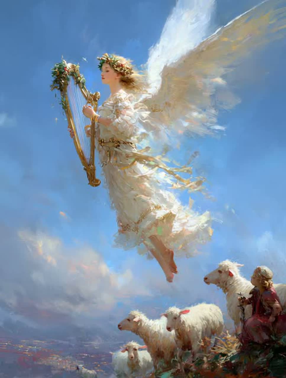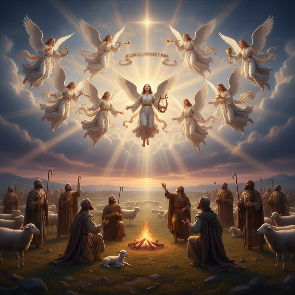 A bombastic and heavenly renaissance Christmas oratorio "Angels We Have Heard on High" blending symphonic grandeur, sacred choral majesty, and operatic passion, A radiant fusion of harp, brass, and full orchestra unfolds beneath soaring tenor and soprano soloists joined by a vast SATB choir in polyphonic counterpoint and thunderous unison climaxes, Angelic harp arpeggios, triumphant trumpet fanfares, and resonant cathedral reverb evoke divine light, awe, and exaltation, capturing the glory of a celestial winter celebration — majestic, theatrical, and transcendent