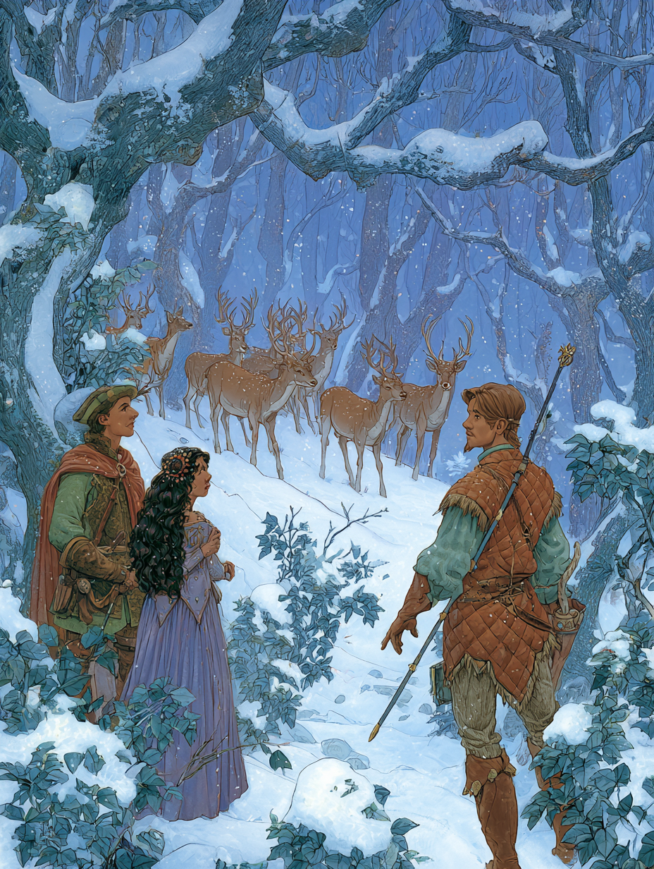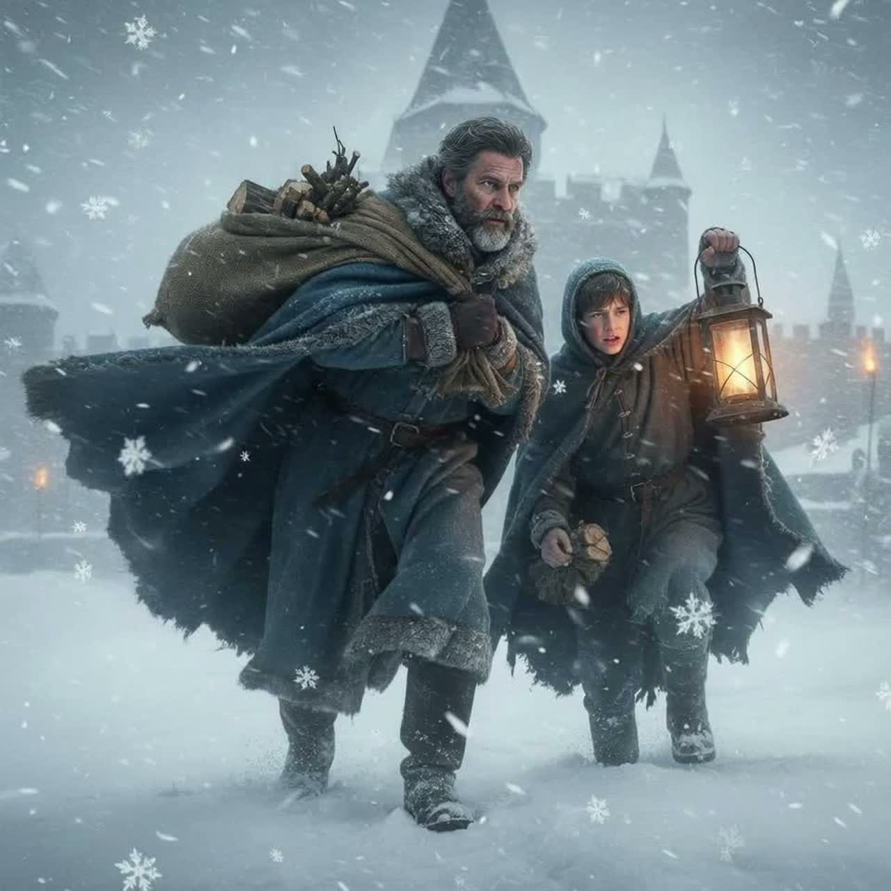 “Good King Wenceslas” performed as a medieval chamber narrative in Dorian and Aeolian modes, Three distinct solo voices: a male tenor narrator, a male baritone Wenceslas, and a female soprano page, Strict role separation with no voice swapping or unison blending, Instrumentation: lute, vielle, recorder, psaltery, portative organ, and hurdy-gurdy, with open-fifth drones and minimal counterpoint, Delivery is chant-like, courtly, sacred, and rubato, evoking the atmosphere of a 12th–13th century oral tradition performance