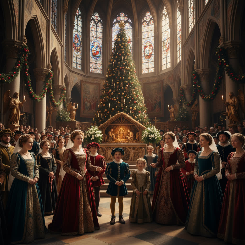 A solemn, a cappella four-part mixed-voice Christmas setting of Lo, How a Rose E'er Blooming, conceived as a Renaissance sacred motet in the style of Orlando di Lassus, Soprano, Alto, Tenor, and Bass enter in staggered imitation, each voice singing the full lyrical text with independent contrapuntal motion, Texture remains purely polyphonic with no homophonic collapse, no block chords, and no modern vocal stylization, The tone is grave, reverent, and liturgical, with restrained dynamics that gradually intensify through layered imitative density, The final stanza expands into a full-ensemble imitative climax, resolving in a sustained modal cadence within a resonant cathedral acoustic