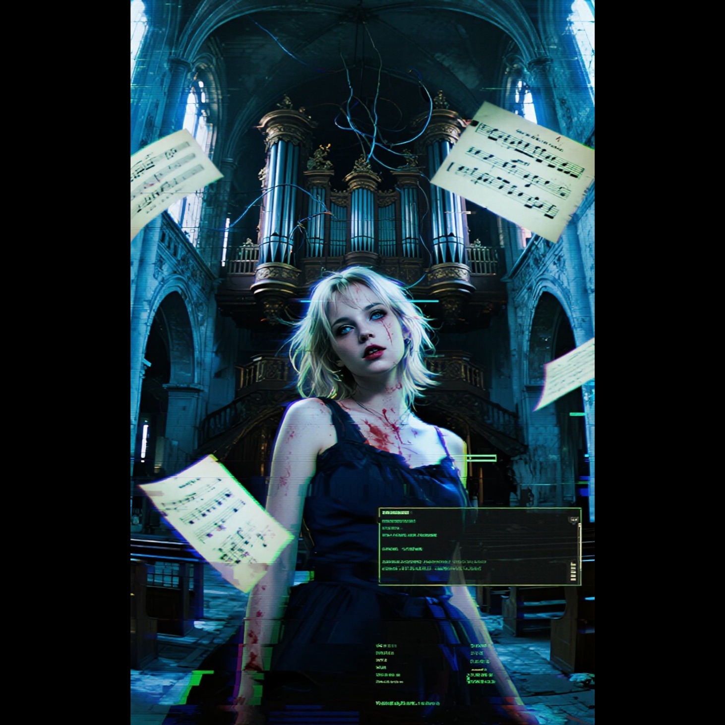 Industrial post-punk fused with deconstructed baroque motifs inspired by Bach, 170 BPM broken tempo, minor key harpsichord fragments chopped into glitch loops, distorted pipe organ drones, cold reese bass, mechanical percussion with metallic hits and ticking clock pulses, Female lead vocal: manic, unstable, oscillating between whispered intimacy and sharp, commanding outbursts, bilingual English/Belarusian delivery with fragmented phrasing and looping words, Choir: ghostly, cathedral-like but degraded, pitch-shifted and detuned, Structure: intro with clean baroque motif > sudden glitch collapse > aggressive verse > fractured chorus with chant-like repetition > disorienting bridge with silence gaps > final chaotic crescendo, Sound design: tape saturation, vinyl crackle, digital artifacts, stereo tearing, Mood: sacred beauty corrupted by system failure, theatrical, obsessive, slightly absurd but emotionally sharp, Clean mix but intentionally unstable dynamics