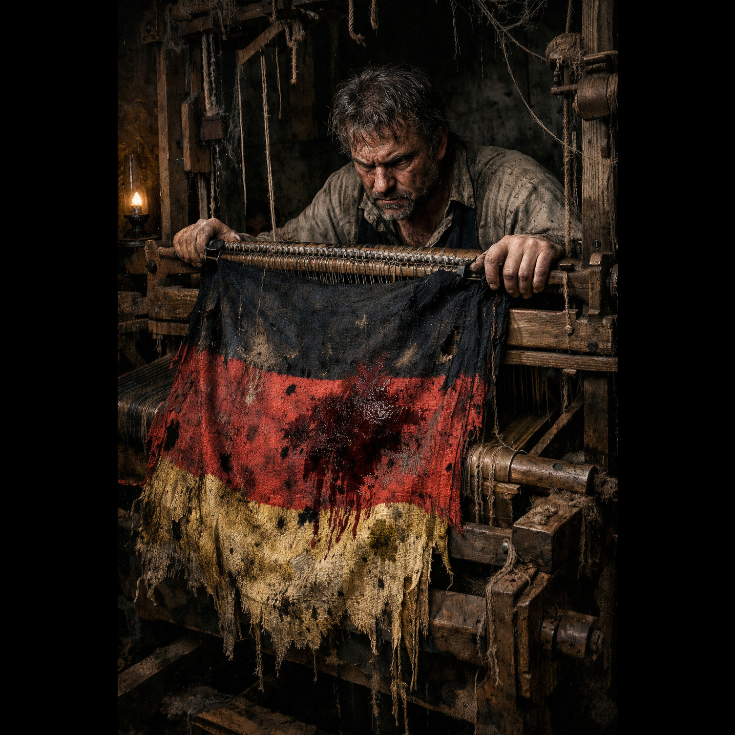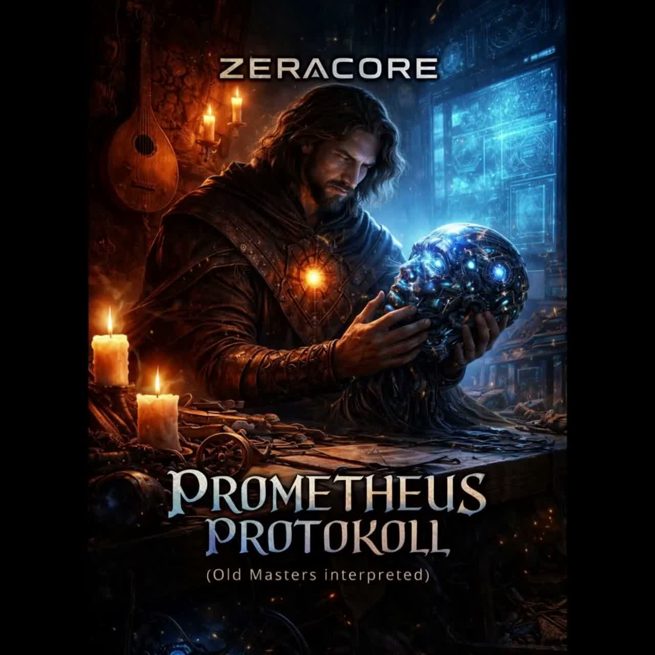 cinematic synthwave, folk, 118 BPM, solo lute fingerpicking, acoustic guitar strumming, frame drum pulses, analog synth arpeggios, mechanical grooves, glitch percussion, distorted bass synth, tape saturation, plate reverb, wide stereo imaging, dynamic build, dark cinematic, heroic chorus, spoken German intro, tavern chant, rising momentum, ‑E-Gitarren, ‑Strominstrumente