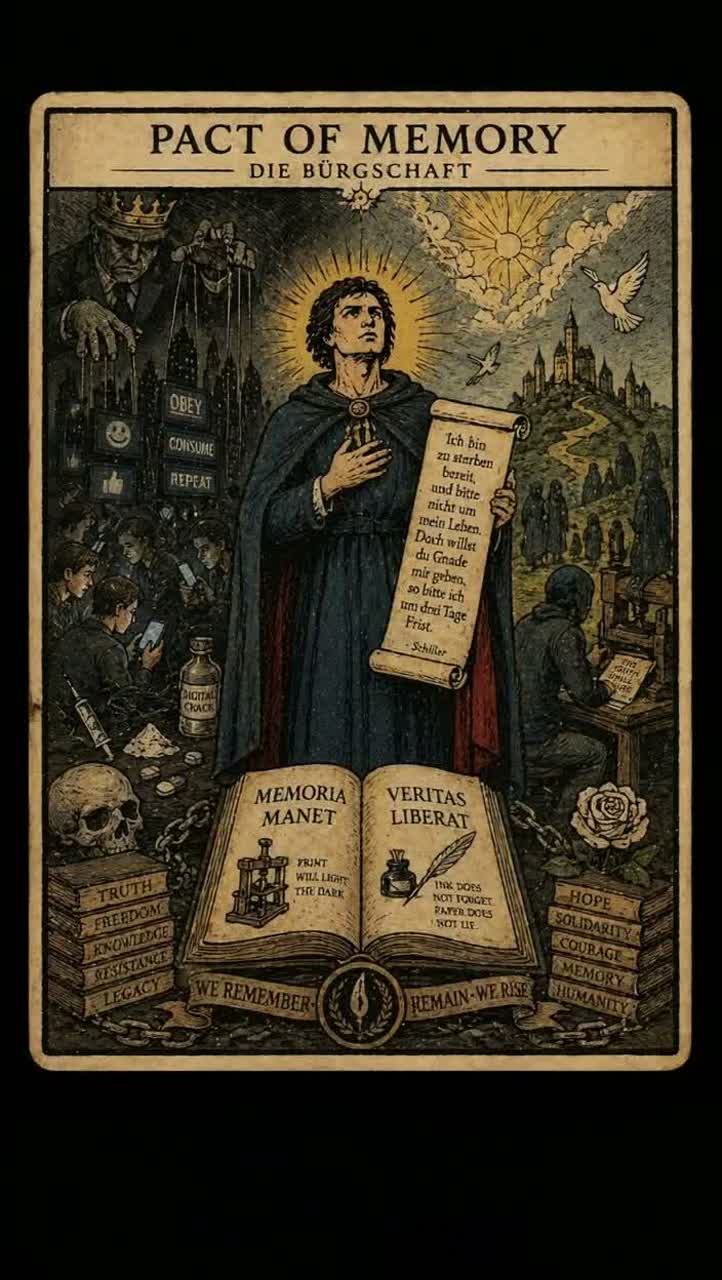 Funeral doom / cinematic gothic metal, 48 BPM slow, dramatic and evolving, Intro: solo piccolo flute, fragile, distant, echoing in vast cathedral space, Spoken voice enters dry and close, Gradual build: massive pipe organ (Voice of Jupiter) with deep sub pipes, heavy sustained chords, cathedral reverb, Low drones, minimal percussion evolving into slow удар-like drums, Instrumentation: dominant organ + low-tuned guitars + sub bass + piccolo flute as emotional counter voice, Vocals: deep growls (dark narrative), clean epic chorus (hopeful), spoken German narration for Schiller quotes (dry, centered, theatrical), Dynamic arc: solitude → tension → darkness → trial → transcendence → triumphant resolution, No modern metalcore, no speed, Sacred, monumental, orchestral doom, Pact of Memory