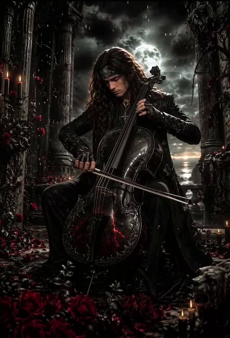 Gothic Metal, Dark Alternative Metal, Gothic Rock, Cello Metal, Vocals should be Male deep, emotional, slightly raspy, intimate in verses almost whispered, powerful, breaking in chorus, spoken word lines poem quotes in The Style Of Ville Valo, Cello low sustained notes dark drone, punctuated cello hits like heartbeats, full emotional swells, Lead Guitar slow, emotional, reverb-heavy, expressive bends in The Style Of Timo-Timo The 69 Eyes, Rhythm Guitar deep, warm distortion, sustained chords in The Style Of Bazie The 69 Eyes, Bass low, thick, almost droning, very present in The Style Of Archzie The 69 Eyes, Drums soft, heavy, deep hits, slow, cinematic pacing in The Style Of Jussi 69 The 69 Eyes, Piano carries verses, simple, haunting chord progressions, emotional anchor, Violin slow swells, tension, emotional lift, Mood & Theme : emotional, love, destruction, inevitability, tragic, melancholic, dark romanticism, guilt, loss, reflective, poetic, haunting