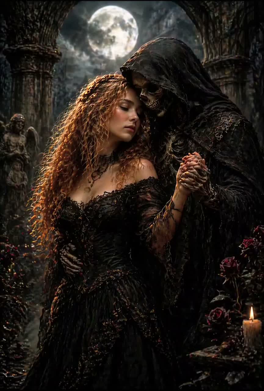 Dark Ritual Folk × Cinematic Dark Ambient × Gothic Chamber, 70 BPM, DUET ONLY, STRICT ORDER, NO OVERLAP, CLEAR VOICE SEPARATION, “STRICT NO HARMONY OVERLAP, CLEAR SOLO LINES ONLY” Female: emotional, haunting, controlled but powerful, Male (Death): deep, calm, ominous, unsettling but not aggressive, Atmosphere: cold night, fog, eerie calm, subtle horror tension, spiritual unease, Instruments: deep piano, low cello drones, dark strings, slow heavy drums (heartbeat + ritual hits), distant bells, subtle choir whispers, ambient pads, occasional low boom impacts, Structure: Intro ambient whispers, Verse female, Pre female, Chorus female (stronger), Verse male, Pre duet (alternating lines only), Chorus duet (separate lines), Bridge male whisper (very dark), Final Chorus female (intense), Outro fading drones, Theme: death as presence, transition, quiet dread, Production: cinematic, wide stereo, dark, organic, no EDM, no pop, no autotune, more low-end, more tension, slightly haunting