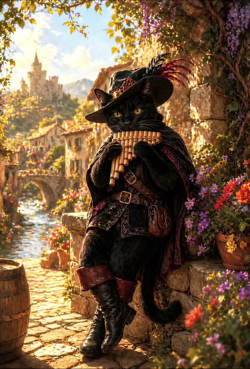 Dark Pagan Folk Metal, Medieval Ritual Folk, Dark Cinematic Pagan Folk Metal with Pan Flute and Whistling, Male Vocals charismatic, storytelling tone, slightly playful, confident, expressive but controlled, a clever narrator who knows more than he tells, Pan Flute intro melody hook, playful runs between vocal lines