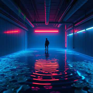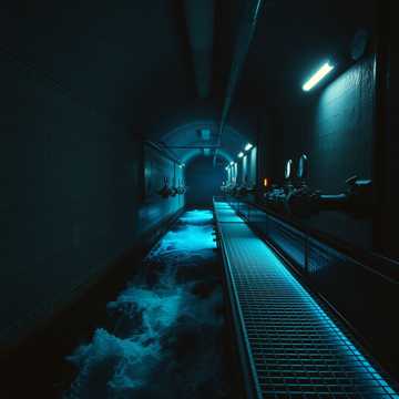 Downtempo, 95 BPM, Echoing boot-stomps on wet metal, bubbling fluid behind glass, warm pulsating synths, damp reverb