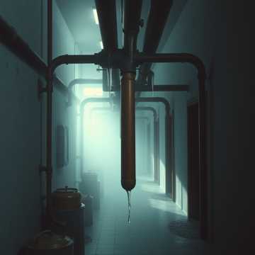 Dub Techno, 100 BPM, Deep echoing delays, rhythmic metallic drips, murky sub-bass, industrial fan hum
