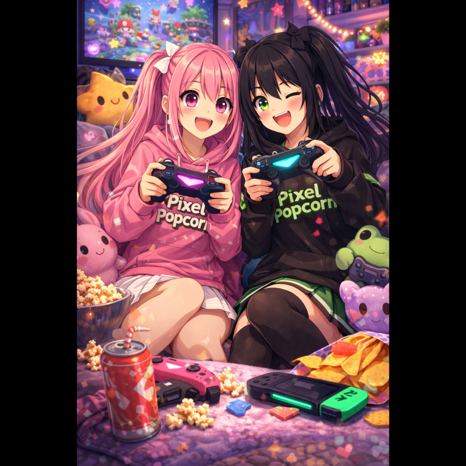 Create a fast paced hyperpop song about two sisters playing video games together on a couch and getting competitive in a fun way, The mood is playful energetic and cute with strong replay value, The lead vocal must be a kawaii youthful female voice with smooth clear pronunciation and expressive personality, The chorus should be simple catchy and repeatable, Include one fast double time rap section delivered by a distinct second female rapper voice with clean rhythmic cadence, The rap must sound clearly like rap, faster and more percussive than the singing, Both voices remain bright playful and confident, The hook phrase “Pixel Popcorn, press play” should be clearly sung at the end of the chorus, Maintain high energy from start to finish with a strong final lift, Target length 2 minutes 30 seconds to 2 minutes 45 seconds, No vulgar content no filler words no clichéd generic phrases proper English sentence structure