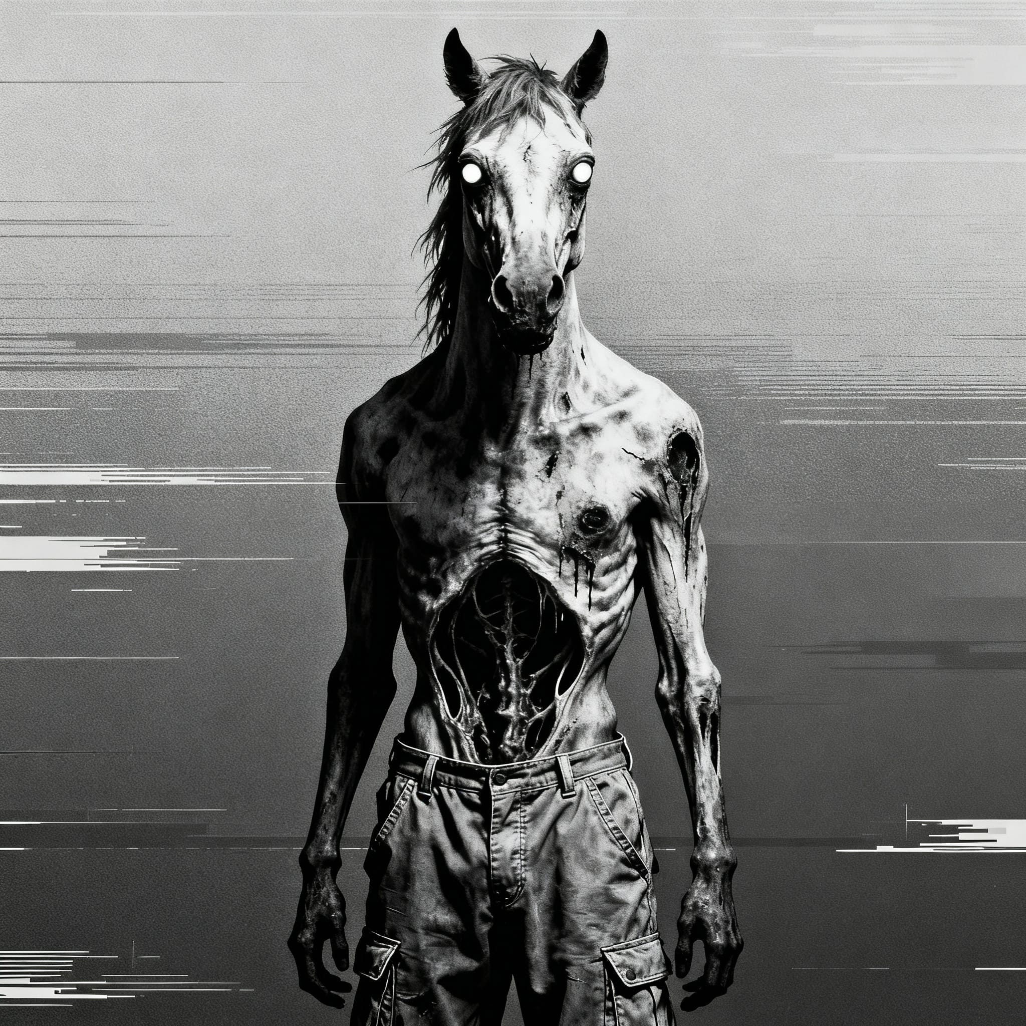 Industrial rhythm, clean but dissonant acoustic guitar, distorted mix, uncomfortable, tense, progressive, shifting constantly, never resolving, horror, layered