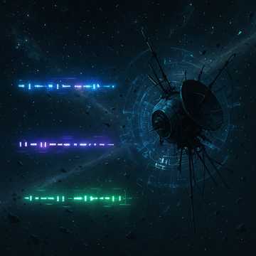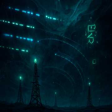 Dark orchestral hybrid fused with synthwave: a cinematic track built on a recurring leitmotif carried by deep cello, low synths, and guitar, The core melody is heavy and resonant, often in lower registers, giving the piece a raw, shadowed character, Throughout, Morse code pulses remain constant, sometimes subtle, sometimes cutting, voiced by synths, violin, or guitar, always connecting but never leading, High-octave motifs appear as recurring flashes—short bright phrases from violin, synth, or guitar harmonics—that pierce the darkness, adding contrast without overpowering the theme, Wide pads and drones provide vast atmosphere, static noise hints at transmission, and guitars shift between reverb-heavy textures and rough riffs, The flow rises from a minimal intro through layered verses, expansive choruses, a Morse-centered bridge, and a massive climax before fading outro where leitmotif, Morse, and motifs vanish together