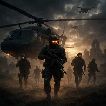 Electronic/Cinematic Hybrid Instrumental • A modern interpretation of war-themed game music • Begins mid-tempo with tactical rhythm and suspenseful atmosphere • Gradually builds toward a faster, thrilling and energetic climax • Combines deep bass textures, cinematic synth layers, military-style percussion, and tension-driven sound design • Music that is both breathtaking and motivating, capturing duty, precision, and the brilliance of elite forces • Designed for the landing scene of a military unit deep in enemy territory • Inspires awe while enhancing the high-stakes drama of a classic war game setting • Features dynamic instrument transitions between sections, evolving tonal palettes, and tension-based rhythmic development • Includes flying changes in timbre, rhythmic shape, harmonic texture, and stereo space to intensify the narrative arc
