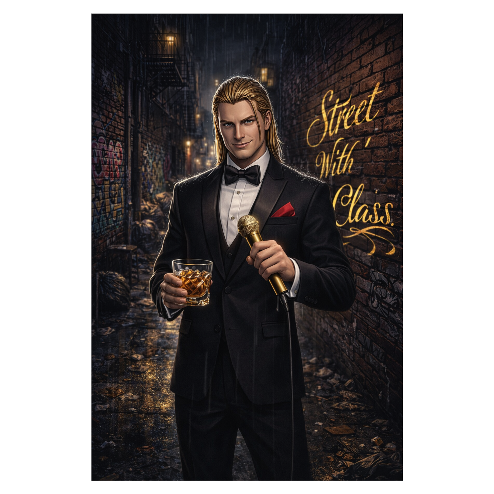 VOCALS: Male rap only, Suave, confident, arrogant but smooth delivery, Less shouting, more precise articulation, INSTRUMENTATION: Dramatic string section (staccato violins), grand piano, heavy 808 glide bass, crisp snare, brass stabs (trumpet/horns), sound of rain and champagne pouring, MOOD: Luxurious, Dangerous, Sophisticated, Gritty